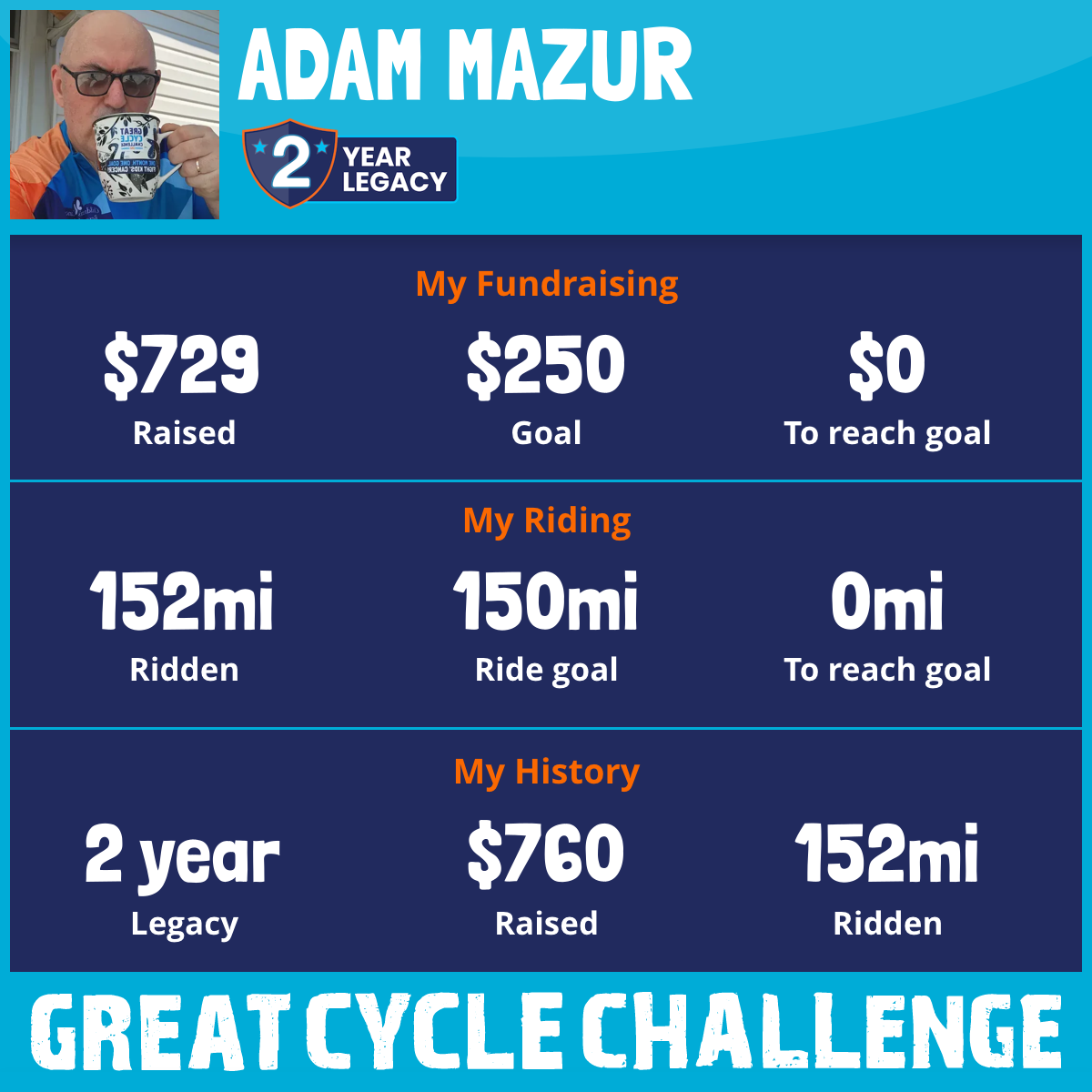 “I'm bad at math but here is to the $250 goal! Awesome stuff youre doing! Also tell Camel to take you out for a nice dinner after the ride!”