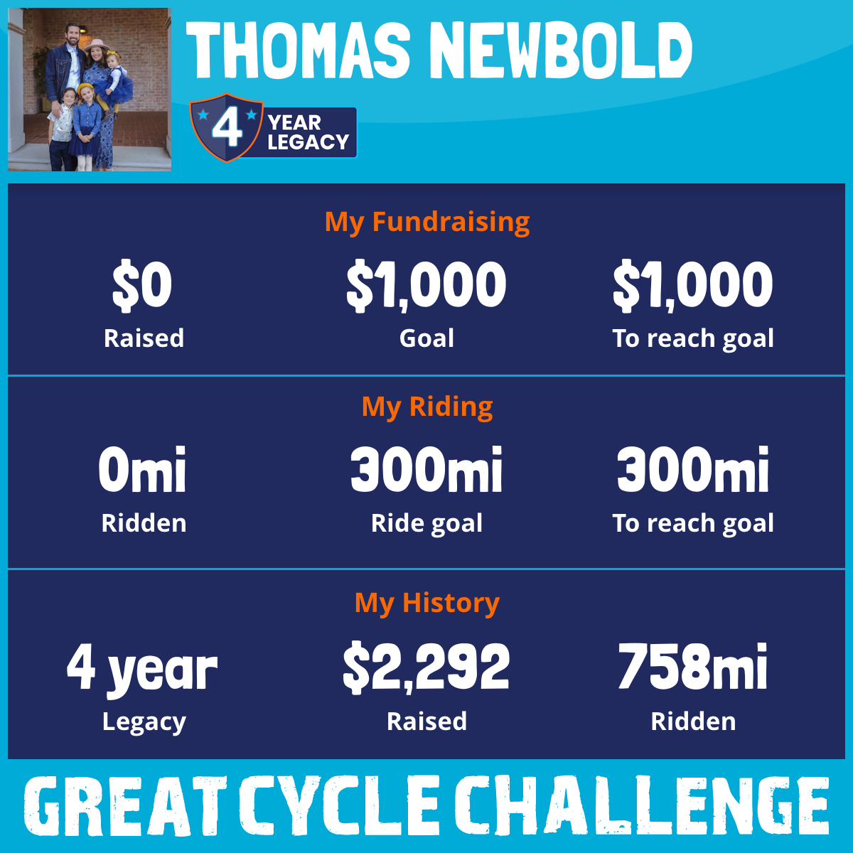 I've raised $0 My goal is $1,000 Donate Now