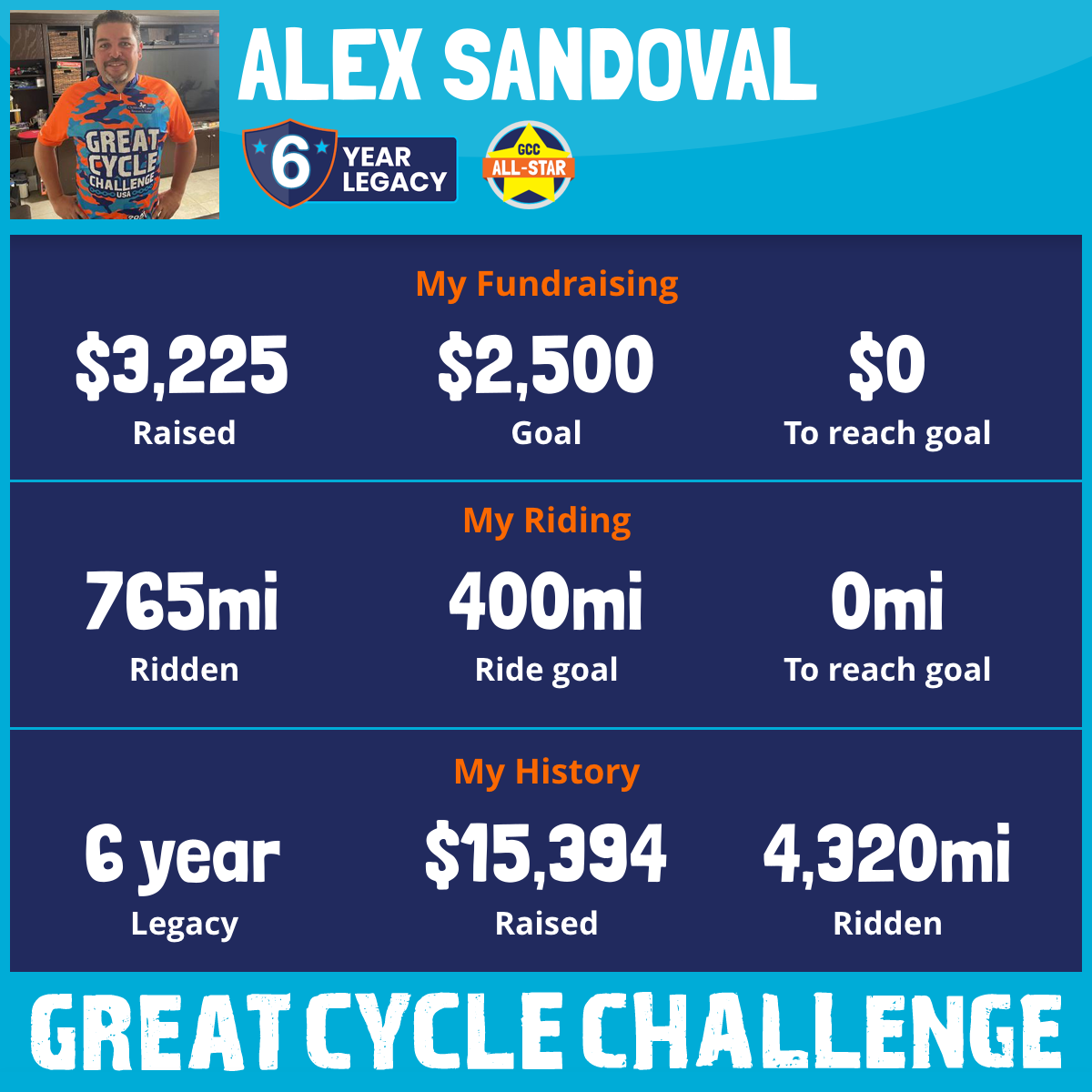 I am riding 400 mi in memory of Jorge Sandoval. Please sponsor me and support my challenge to fight kids' cancer and save little lives.