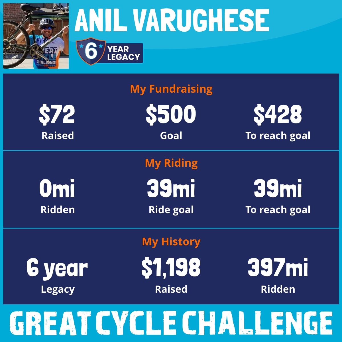 I am riding 39 mi in memory of VP Varughese. Please sponsor me and support my challenge to fight kids' cancer and save little lives.