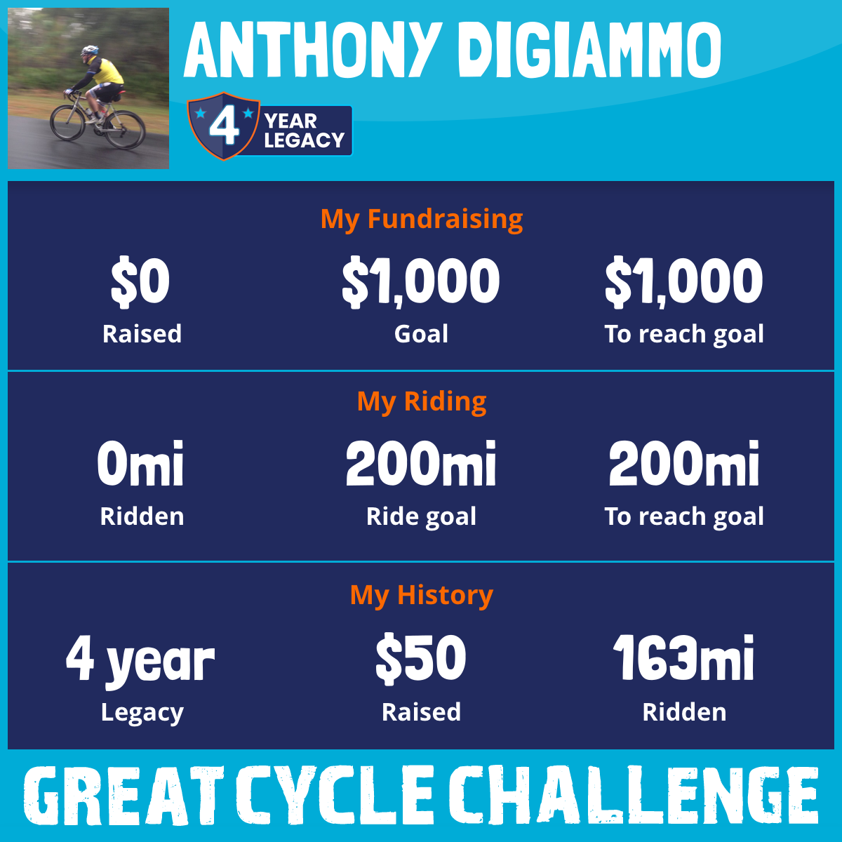 I've raised $0 My goal is $1,000 Donate Now