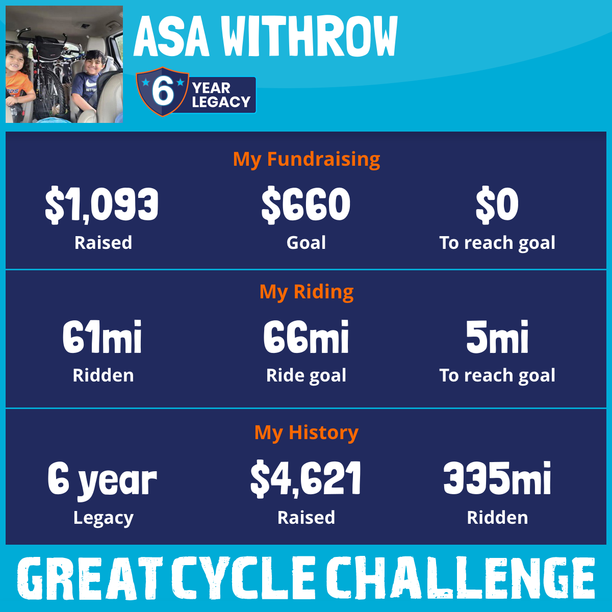 I want to ride 66miles and set a fundraising goal of $660, for year "6"!! No amount too small.