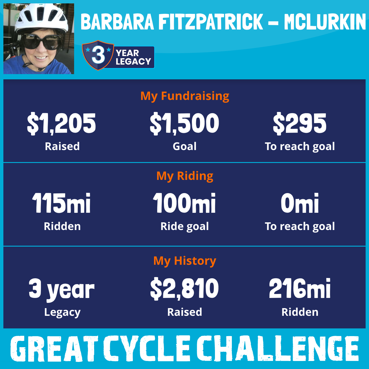 • Donate Online: https://greatcyclechallenge.com/riders/BarbaraFitzpatrick-McLurkin