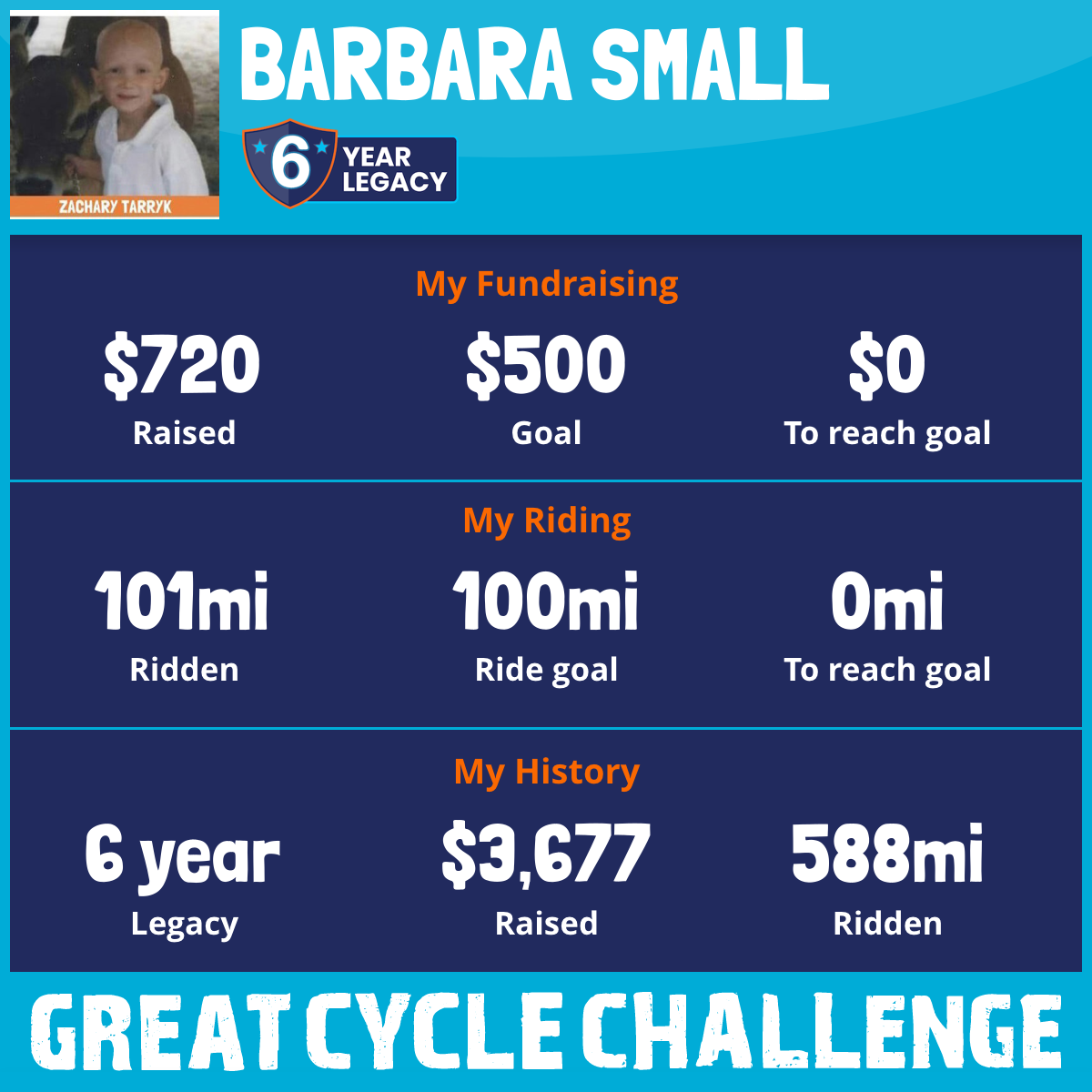 I am riding 100 mi for my loved one, Zachary Tarryk, My Sister-in-laws: Robin Grimes, Audrey Antosz, Laurie Martell, & my late parents. Please sponsor me and support my challenge to fight kids' cancer and save little lives.