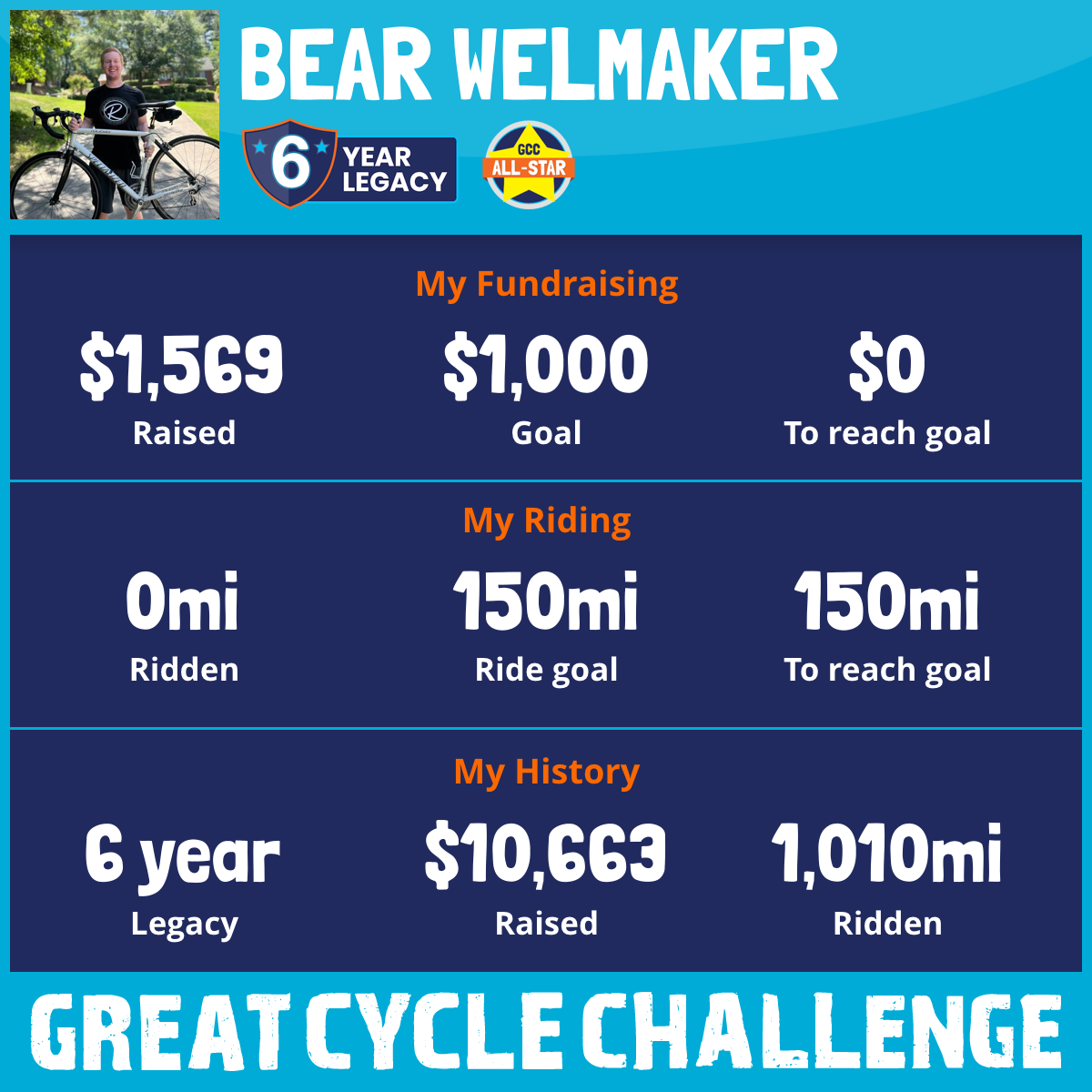 Over the past 6 years we have raised over $9,000 and I have ridden over 1,000 miles for the Children’s Cancer Research Fund!