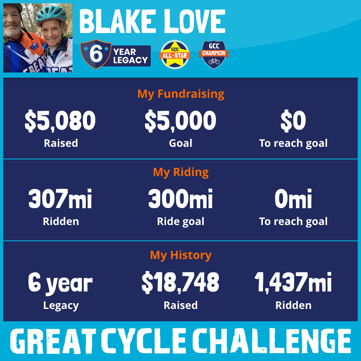 This September, I am taking part in the Great Cycle Challenge to fight kids' cancer! This is my 6th year of participating and I have increased my goal to 300 miles with Kathy's help and increased my goal to raise $5000.00 with your help.