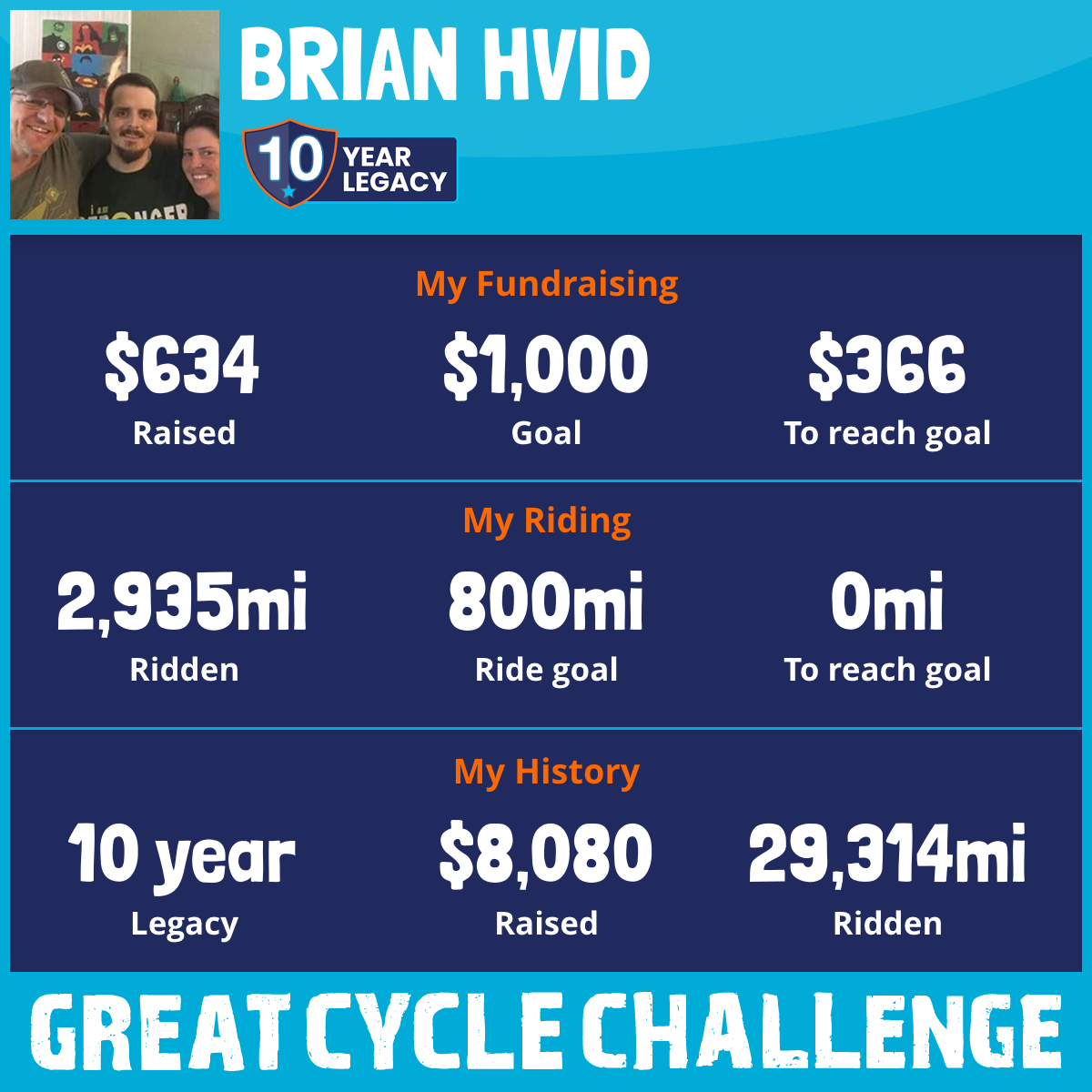I am riding 800 mi in memory of Dean N Hvid. Please sponsor me and support my challenge to fight kids' cancer and save little lives.