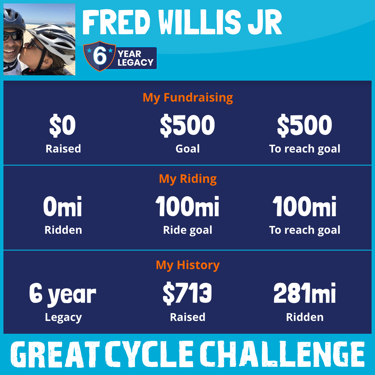I am riding 100 mi for Fred Willis Sr. Please sponsor me and support my challenge to fight kids' cancer and save little lives.