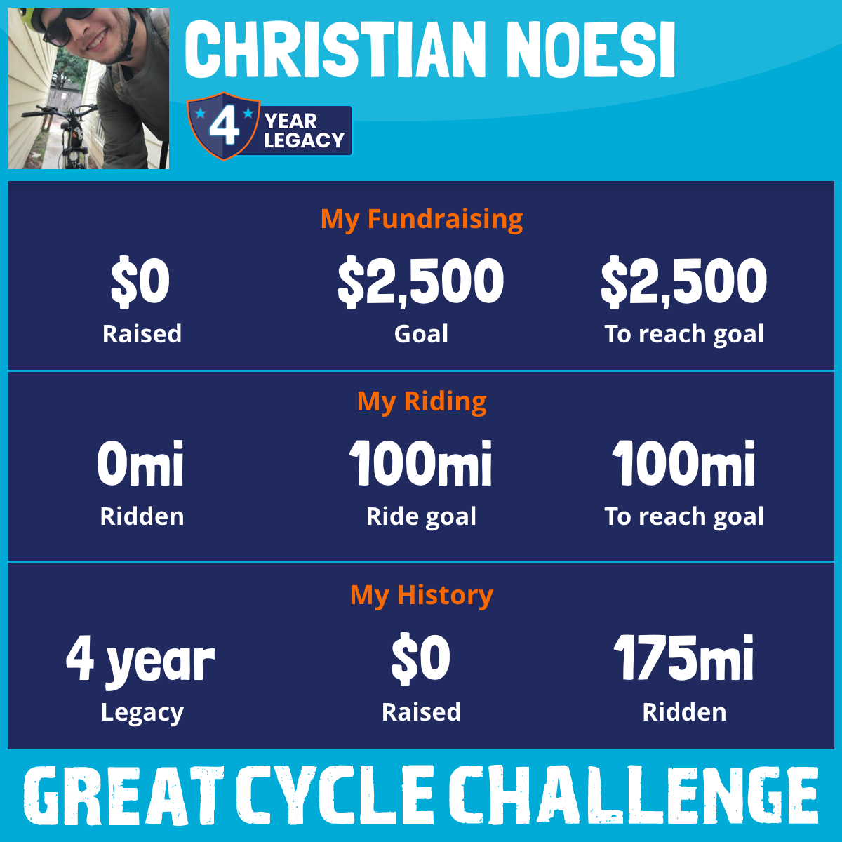 for children with cancer. My goal is to log at least 20, 10+ mile rides and raise $500.