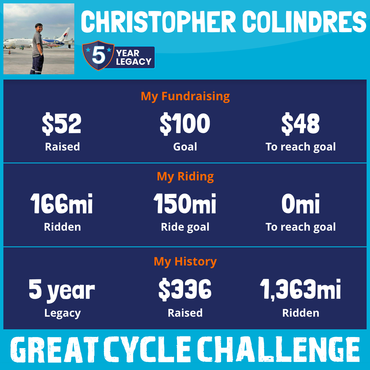 I am riding 150 mi in memory of my son, Christian Lourd G. Colindres. Please sponsor me and support my challenge to fight kids' cancer and save little lives.