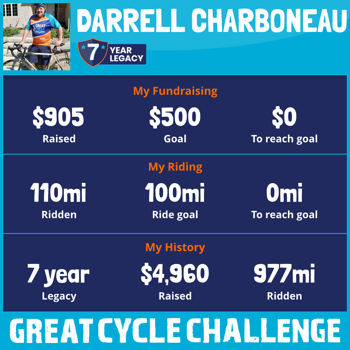 This September, I am taking part in the Great Cycle Challenge to fight kids' cancer! I am also riding for myself. My cancer journey started 5 years ago. I am on daily cancer drugs, and my tumor and cancer are stable at this time. I had a hard time finishing my goal last year, but thankfully I am here to try achieve my 100 mile goal this year. I have been doing physical therapy to try regain strength to ride this year. This is my 7th year riding the GCC challenge. I just take one day, one month, one year at a time.