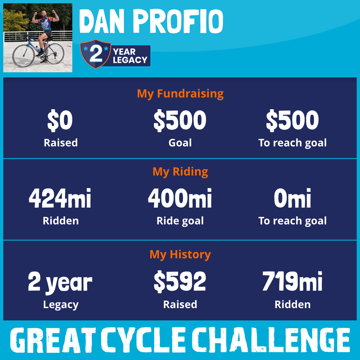 Hello, my name is Dan, and I live in Milwaukee, Wisconsin. I've been passionate about riding my bike since I was a kid, and it has always been a significant part of my life. Just this month (July), I biked 200 miles to prepare for the upcoming Great Cycle Challenge in September. I wanted to prove to myself that I could do it again for a cause that inspired me.