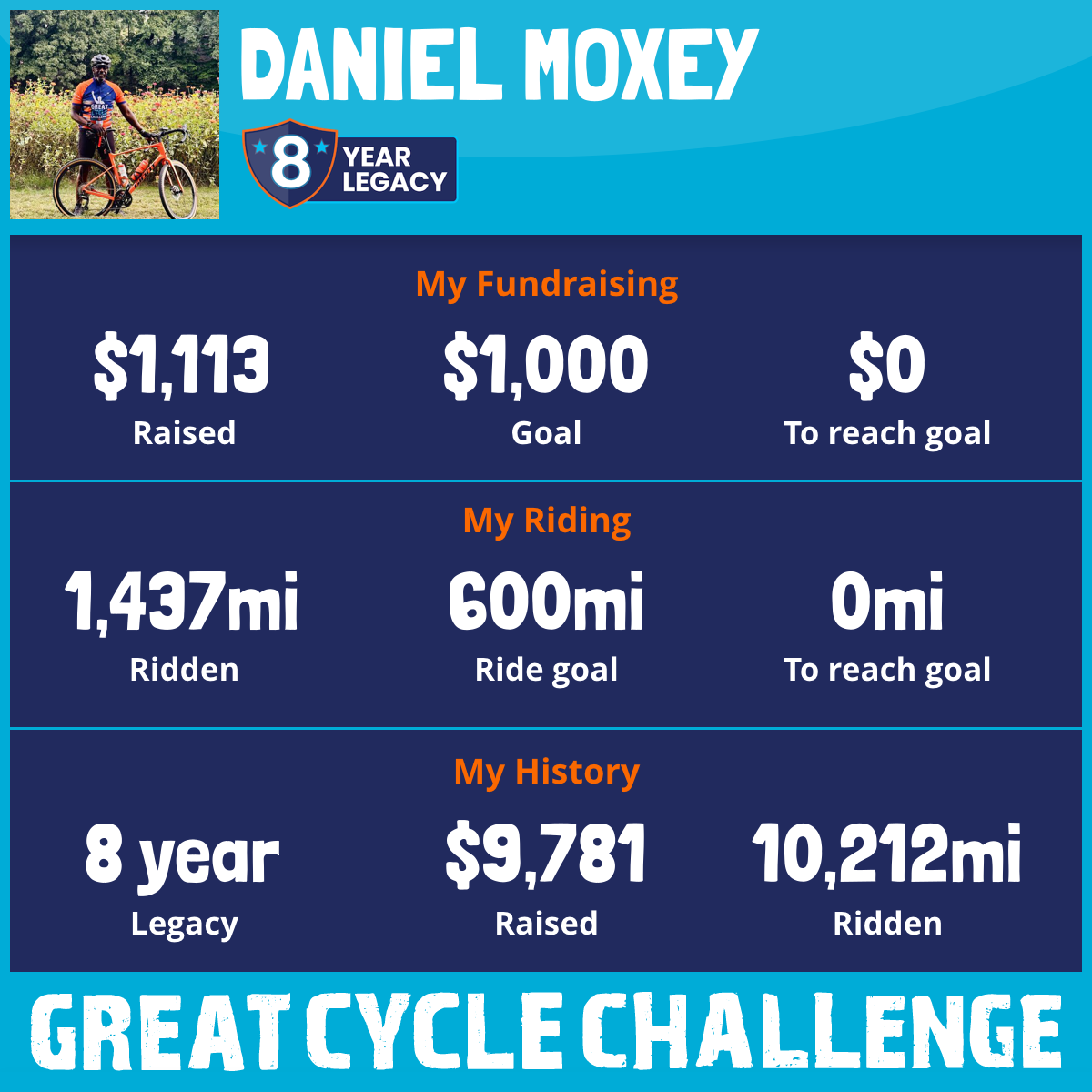 Check out my dashboard :https://greatcyclechallenge.com/Riders/DanielMoxey