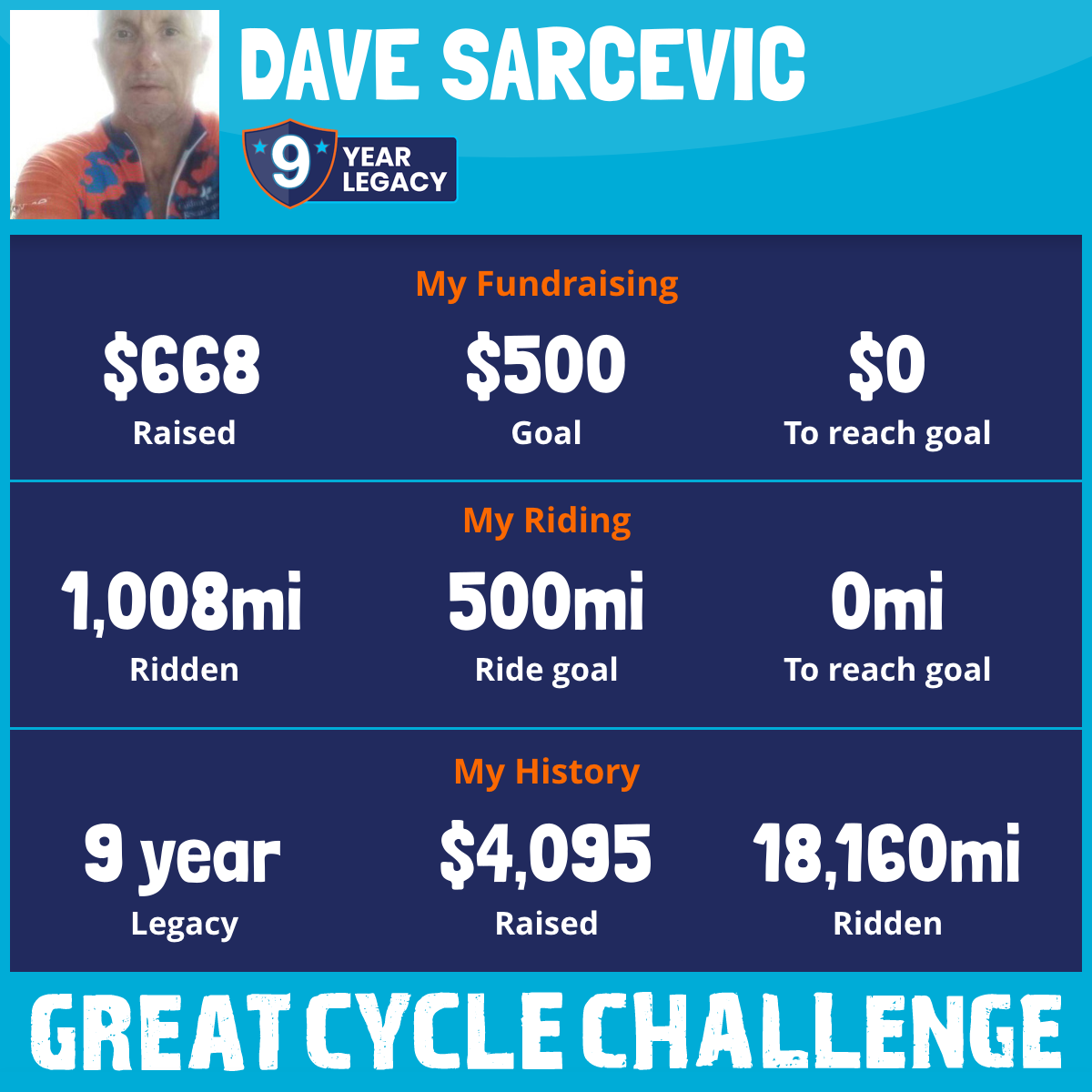 I am riding 500mi in memory of Ana Sarcevic. Please sponsor me and support my challenge. I will try to ride more miles, as my health improves. Thanks.