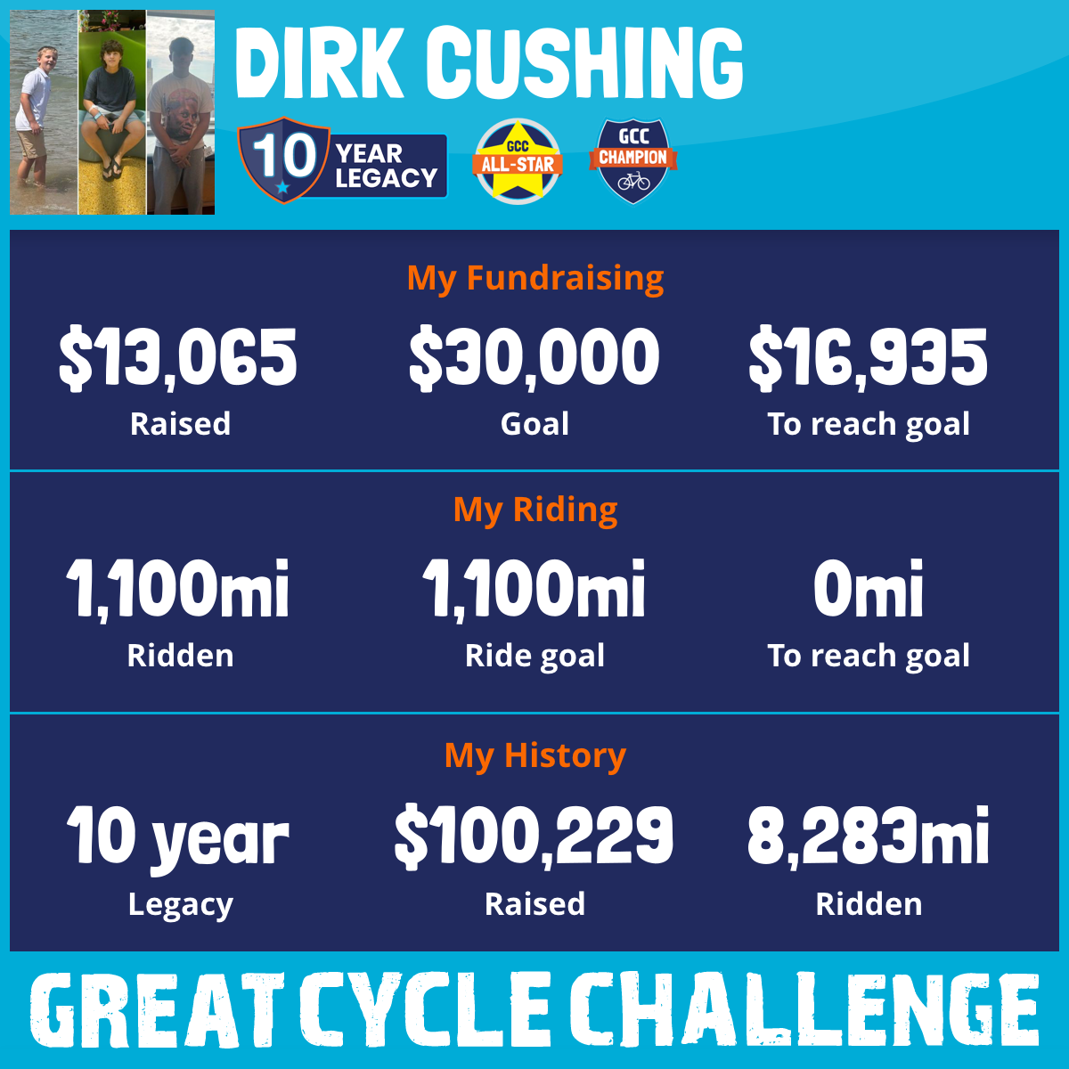 This will be my tenth year riding in the Great Cycle Challenge. And throughout the years I have teamed up with Joe, Avery, Lucas, and Samuel. And the one thing all of these young people have in common is that they all kicked cancer's butt! Two years ago I rode for Aubrey. This courageous young lady lost her fight with this terrible disease. For Logan, the brother of Samuel and Lucas, the battle is ongoing. You can follow his fight as well as the most recent updates on Samuel and Lucas at https://www.facebook.com/keepingSamuelStrong or "Logan, Lucas and Samuel fight on"