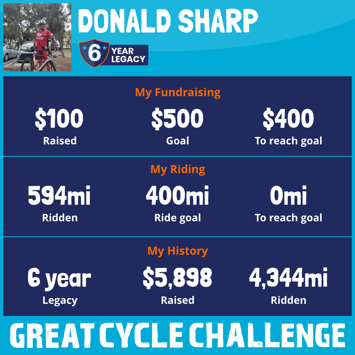 I am riding 400 mi for Donald sharp. Please sponsor me and support my challenge to fight kids' cancer and save little lives.