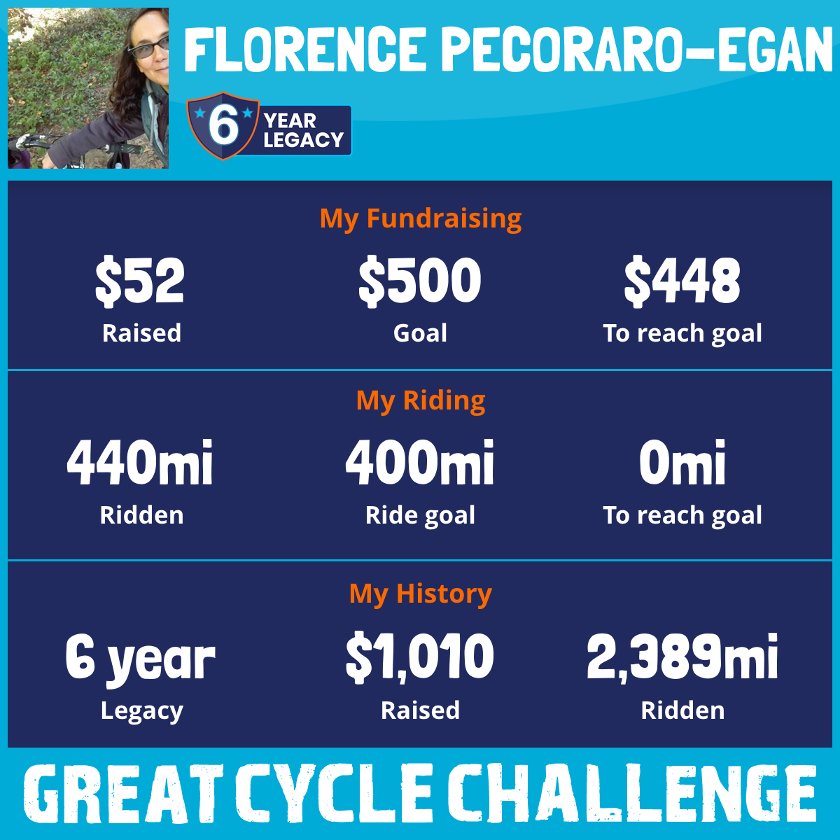 I am riding in memory of my brother, Vincent, who passed away in 1973 due to Acute Leukemia. Back then, there were less treatments available and he didn't have Recreational Therapy to better his quality of life. I remember him watching the kids outside playing while he tried to stand up from is wheelchair. I founded Fun For Cure, Inc. to benefit children like him. He was diagnosed at age 7 and passed away on September 20th at age 9... I will forever pray for, support, and strive to help other children with cancer. I pledge to participate in the Great Cycle Challenge every year from now on, God willing, and I pledge to devote my future work to raise awareness for children with cancer and for all children in need. My pledge includes raising awareness via Great Cycle Challenge and other organizations such as Fun For Cure, Inc., who actively and directly advocate for children like my brother, on a daily basis! You can donate here and you can also support my 501(c)(3) nonprofit that brings FUN into the lives of children with special and medical needs. Together we help combat any negative experiences before they occur! The journey is the goal! Visit us at www.funforcure.org Thank you, Florence
