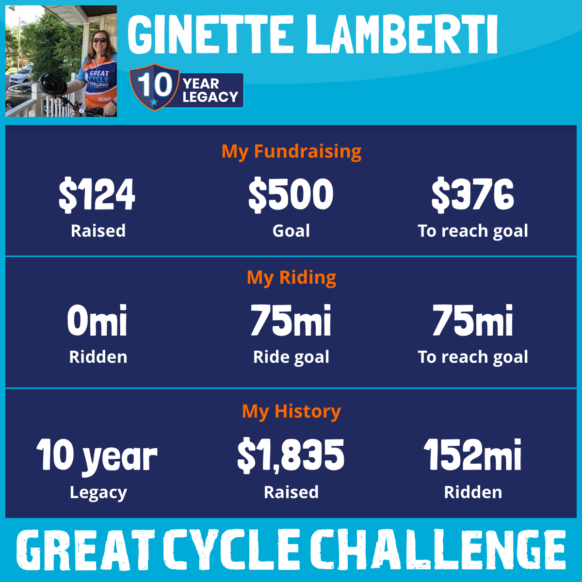 I've raised $124 My goal is $500 Donate Now