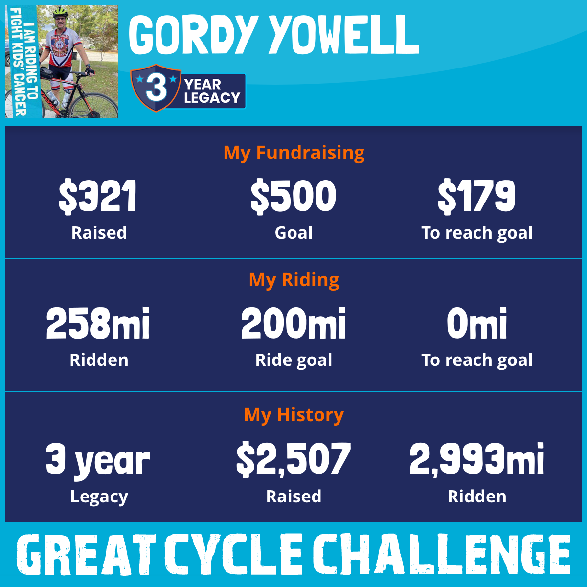 30 Sep 2025I have been bike riding annually for a few years now to raise funds for the Children's Cancer Research Fund. This year I thought I would find a unique way to cap off my bike riding exploits with something that shows my commitment to this great cause. So what better way to cap off my bike riding pledge of 200 miles for the month of September than with completing a full marathon (26.2 miles). Yep, moving a little slower today, but I completed the Boulder, CO Marathon on Sunday, be it at a snails pace. I did experience the negative affects excessive altitude has on the lung capacity of old guys like me - so much for training at sea level-LOL. Honestly If these physical efforts are successful in raising the funds necessary to help find cures for childhood cancer then I'll keep pounding, and riding the pavement until I can't do it any more. THANK YOU FOR YOUR SUPPORT AND ATTENTION!!! Feel free to text me to verify this is a very legitimate fund raiser! Gordy