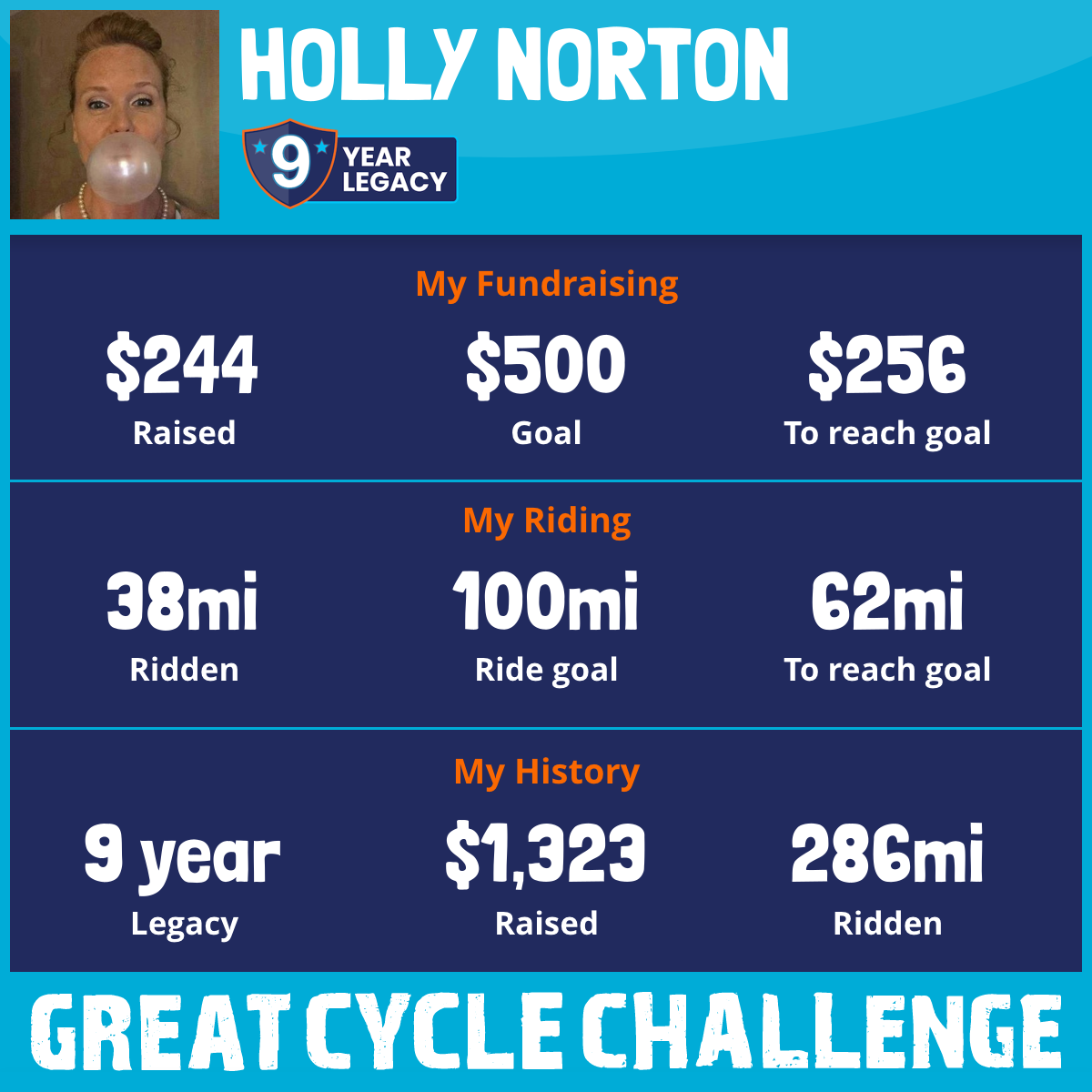 24 Jun 2025September 1 kicks off my 9th year with Great Cycle Challenge!! I am ready! Keep up with my progress on Facebook and cheer me on and, if you feel compelled, donate to the cause.