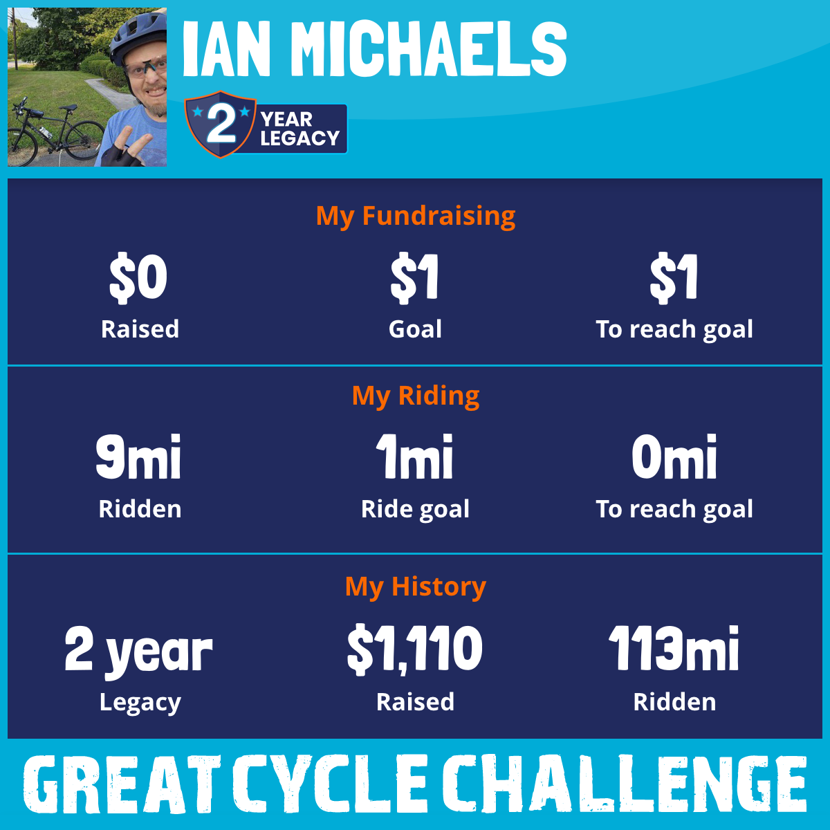 This September, I am taking part in the Great Cycle Challenge to fight kids' cancer! I am going to try to ride 100 miles. It will be tough, but this is a challenge after all!