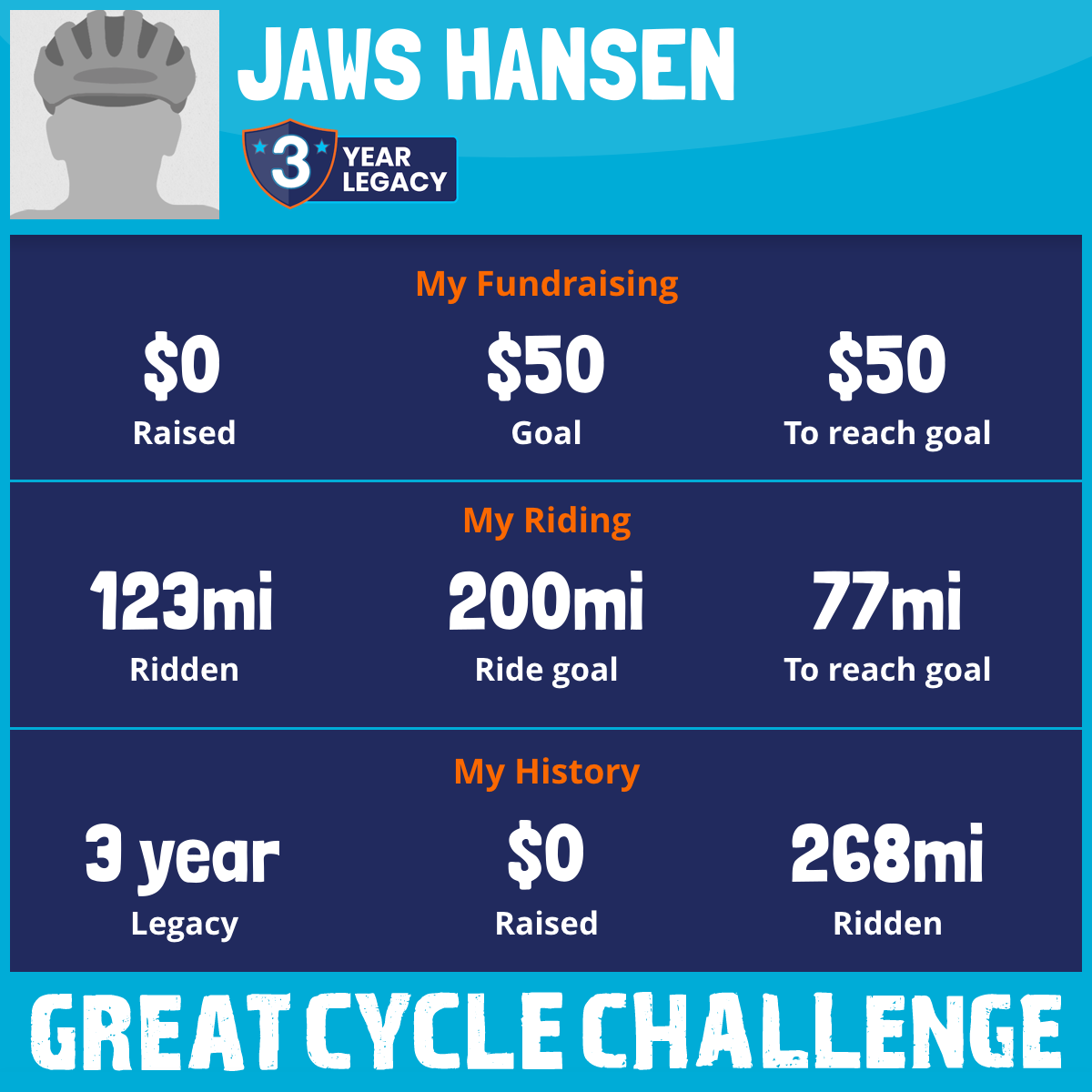 I am riding 200 mi to fight kids' cancer and save little lives. Please sponsor me to support my challenge!