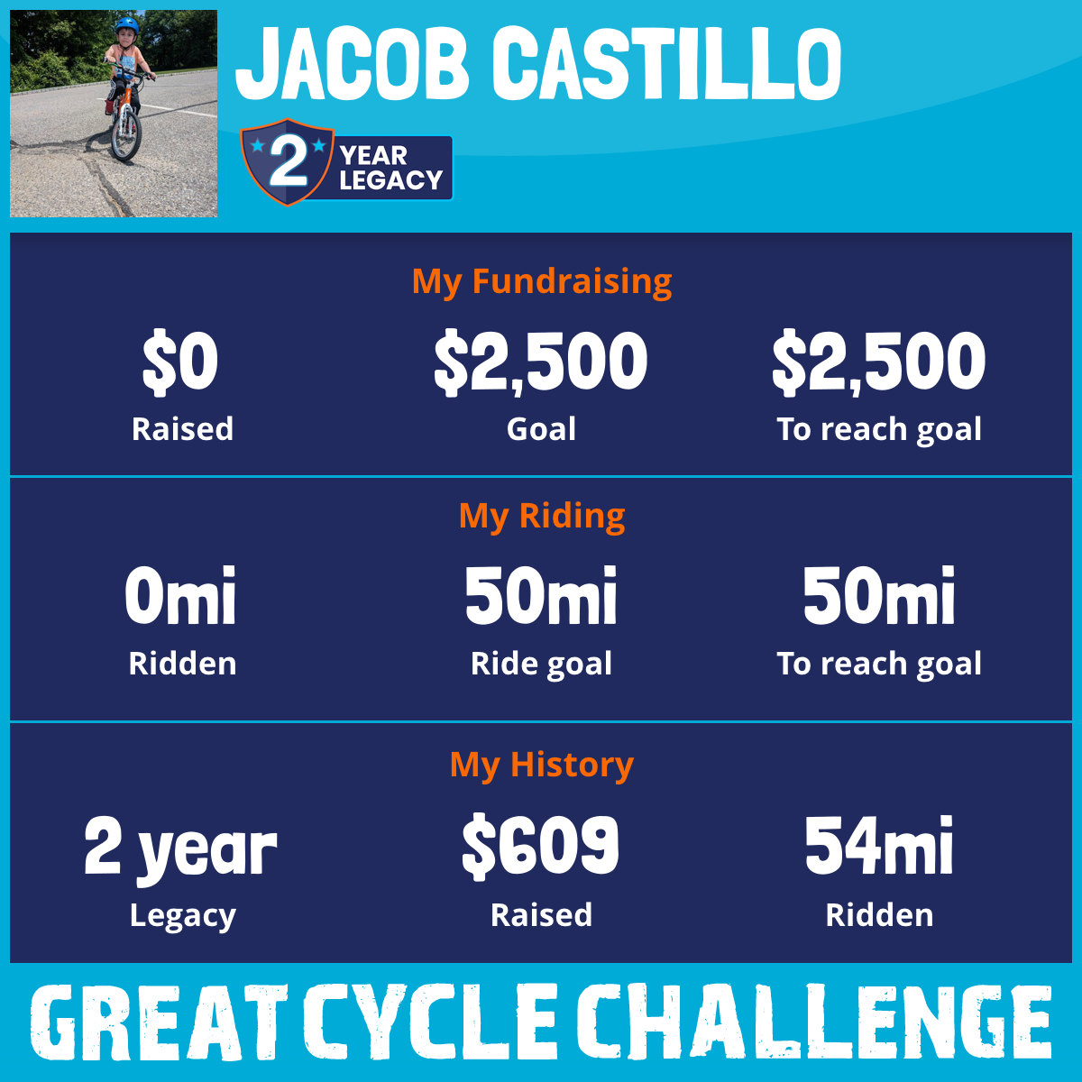 Mi nombre es Jacob. Tengo 5 años y esta es mi segunda vez que participo en el Great Cycle Challenge. Mi objetivo es recorrer 50 millas en septiembre y mi objetivo de recaudación de fondos es $2500. Cada donación, incluso la más pequeña, ayuda a los niños a disfrutar de días mejores y a superar el cáncer. Espero que todos los que me conocen me apoyen y me ayuden a alcanzar mi objetivo, y tal vez incluso ir más allá. Haré mi parte y recorreré 45 millas este septiembre.
