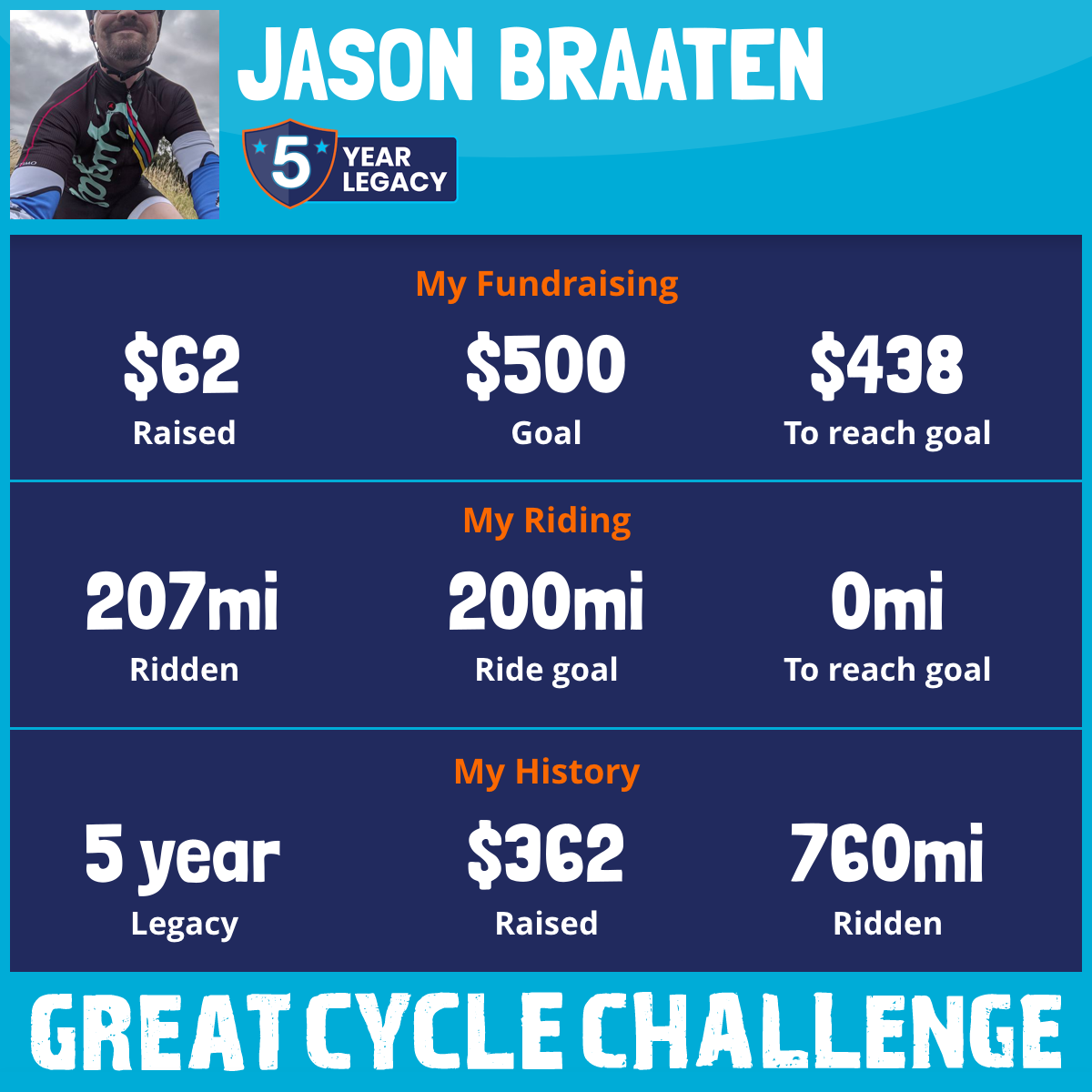 I am riding 200 mi in memory of DuWayne Braaten. Please sponsor me and support my challenge to fight kids' cancer and save little lives.