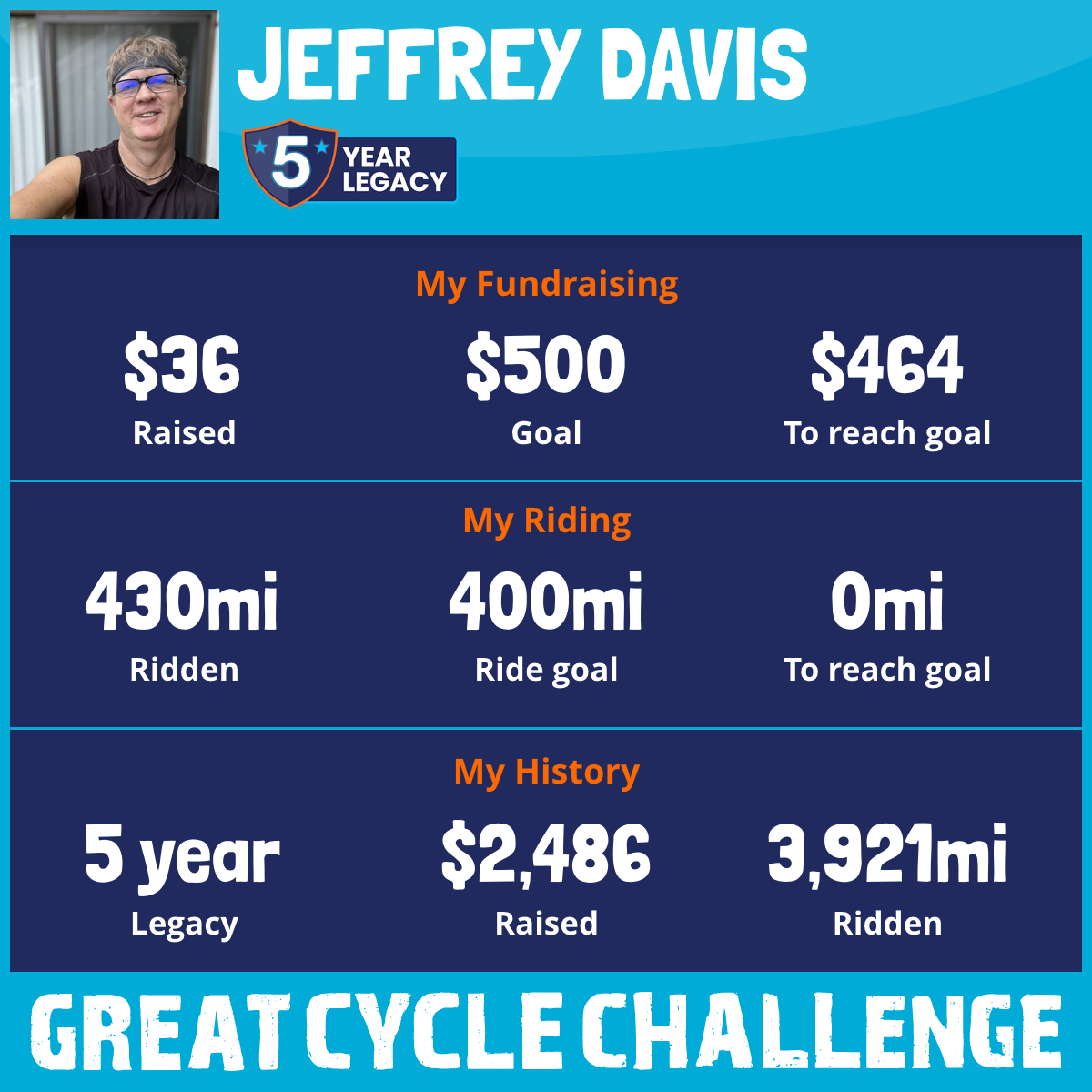 I am riding 400 mi for my uncle, Jackie. Please sponsor me and support my challenge to fight kids' cancer and save little lives.
