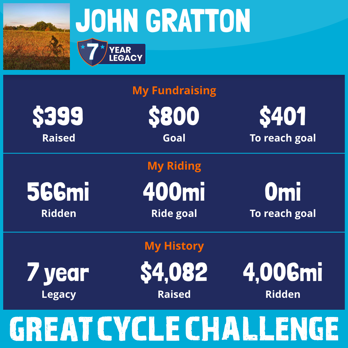 I am pleased and blessed to be part of the Great Cycle Challenge again. This is my seventh year riding to help fight kids' cancer, which is the biggest killer of children from disease in the United States.