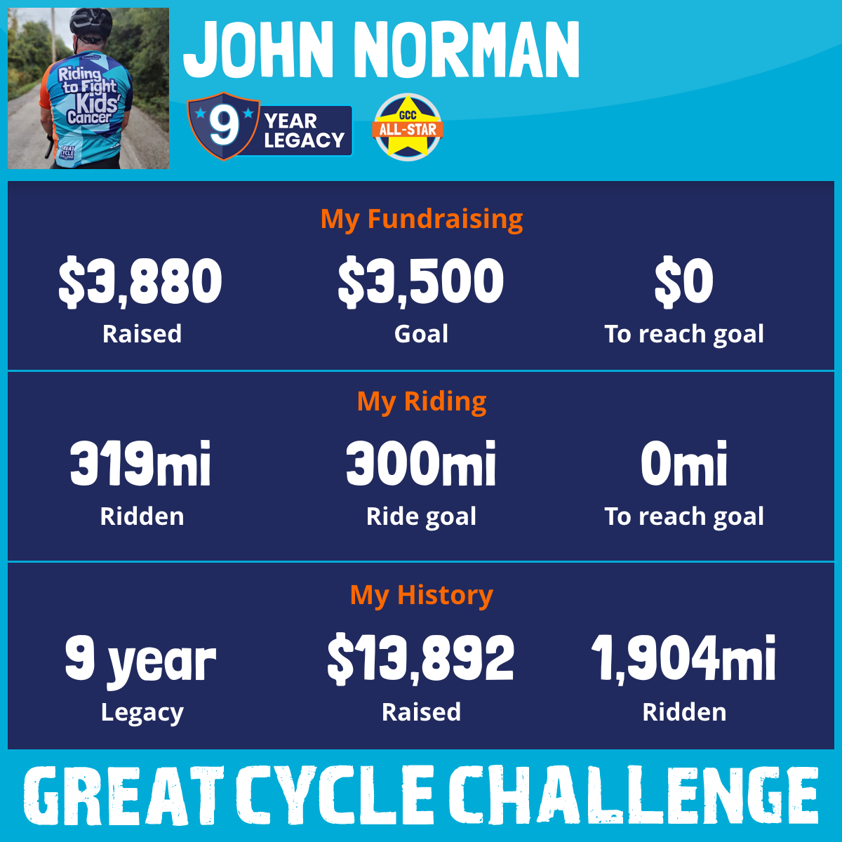 I choose to do one fundraiser a year. 2026 will be my 10th year participating in the Great Cycle Challenge and will be riding this September to fight kids' cancer! My goal is to pedal 300 miles throughout the month.