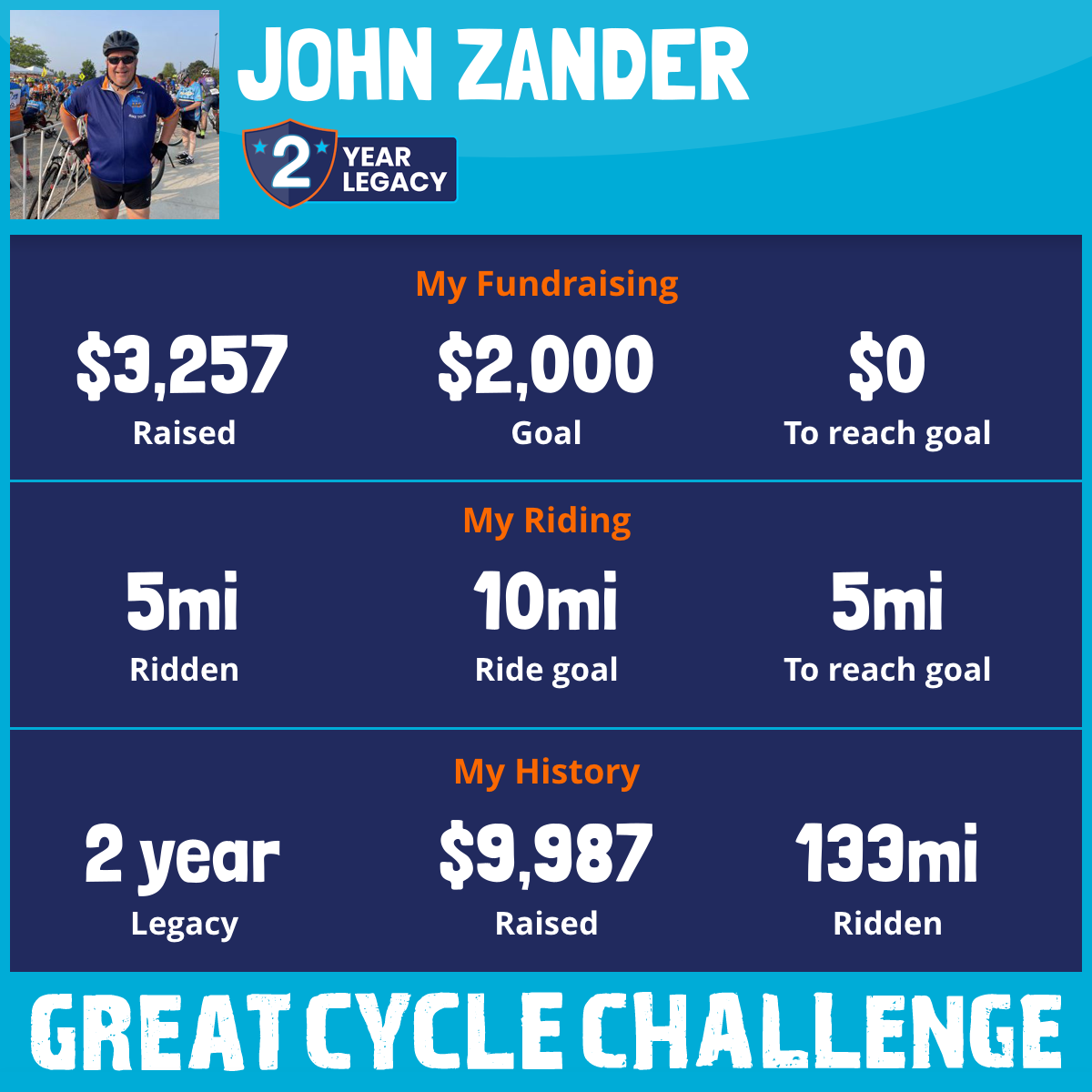This September, I am taking part in the Great Cycle Challenge to fight kids' cancer! But as you can see I only pledged to ride 10 miles. Why you might ask? Well this spring I had a reoccurrence of my prostate cancer. September 2 will be my last of 39 radiation treatments plus, I’m also doing hormone and therapy. Between the two of them, my energy level is in the basement along with other side effects. However, I hope to be back on my bike towards the end of September.