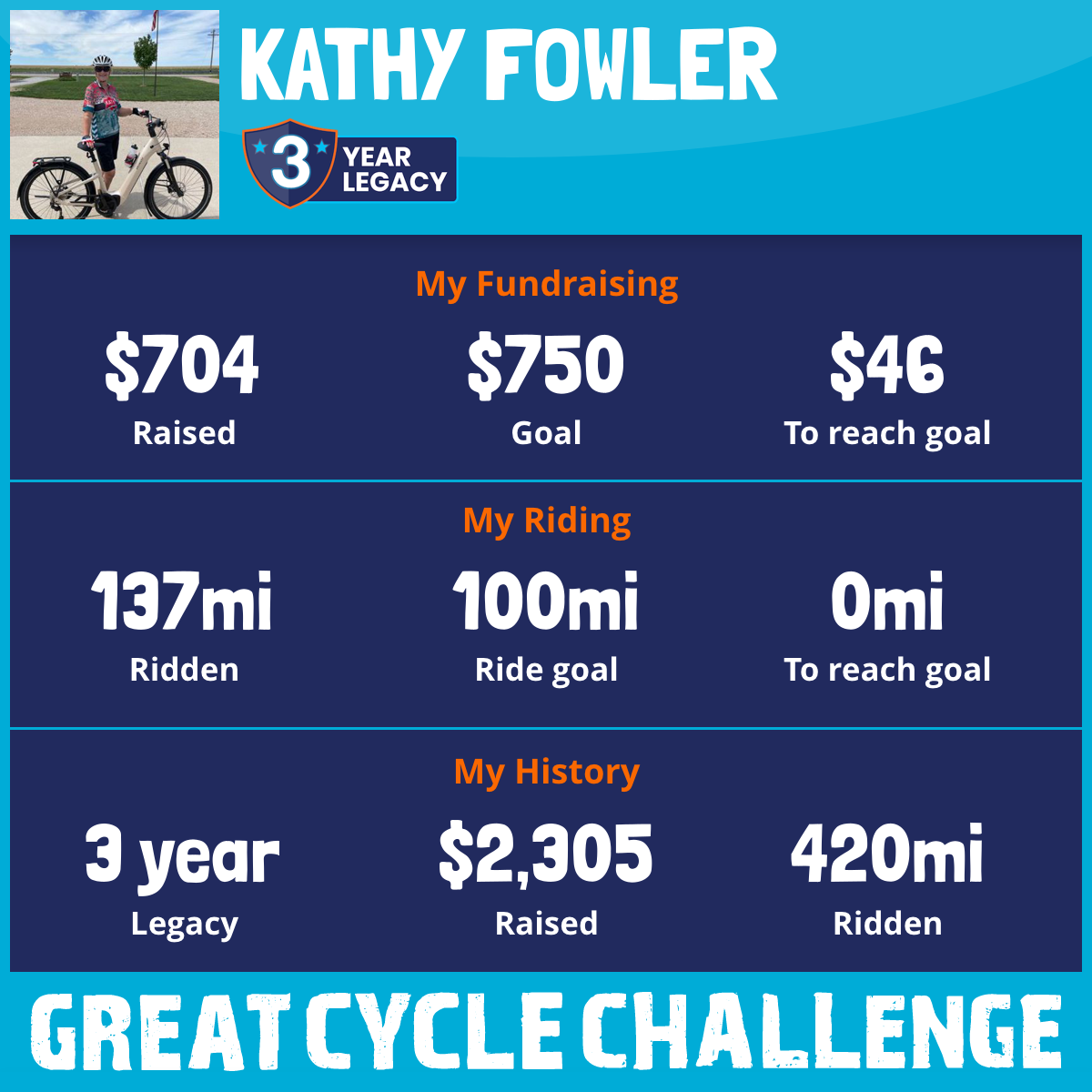 I am riding 100 mi for my husband, Ron Fowler, a cancer survivor. Please sponsor me and support my challenge to fight kids' cancer and save little lives.