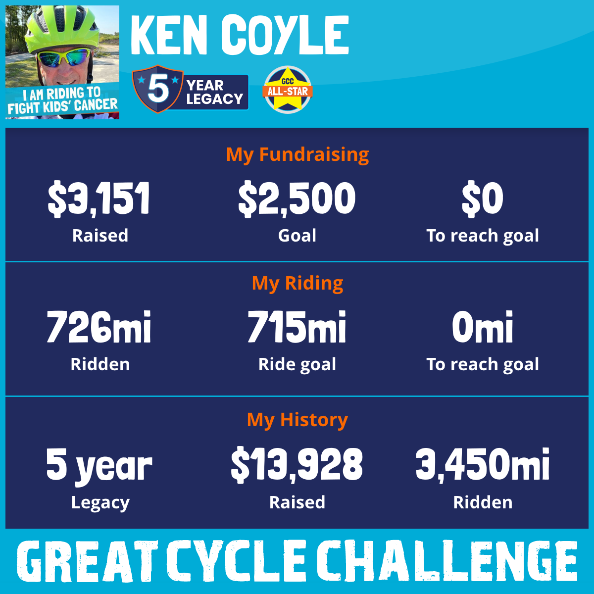 This is my 5th year participating in the Great Cycle Challenge. It has been a privilege and an honor to be a small part of this organization.