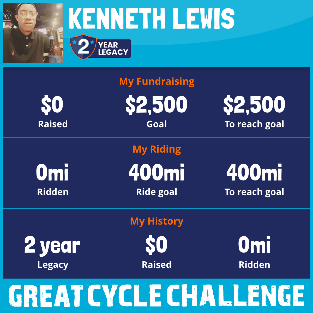 I am riding 400 mi for Kenneth Brady. Please sponsor me and support my challenge to fight kids' cancer and save little lives.
