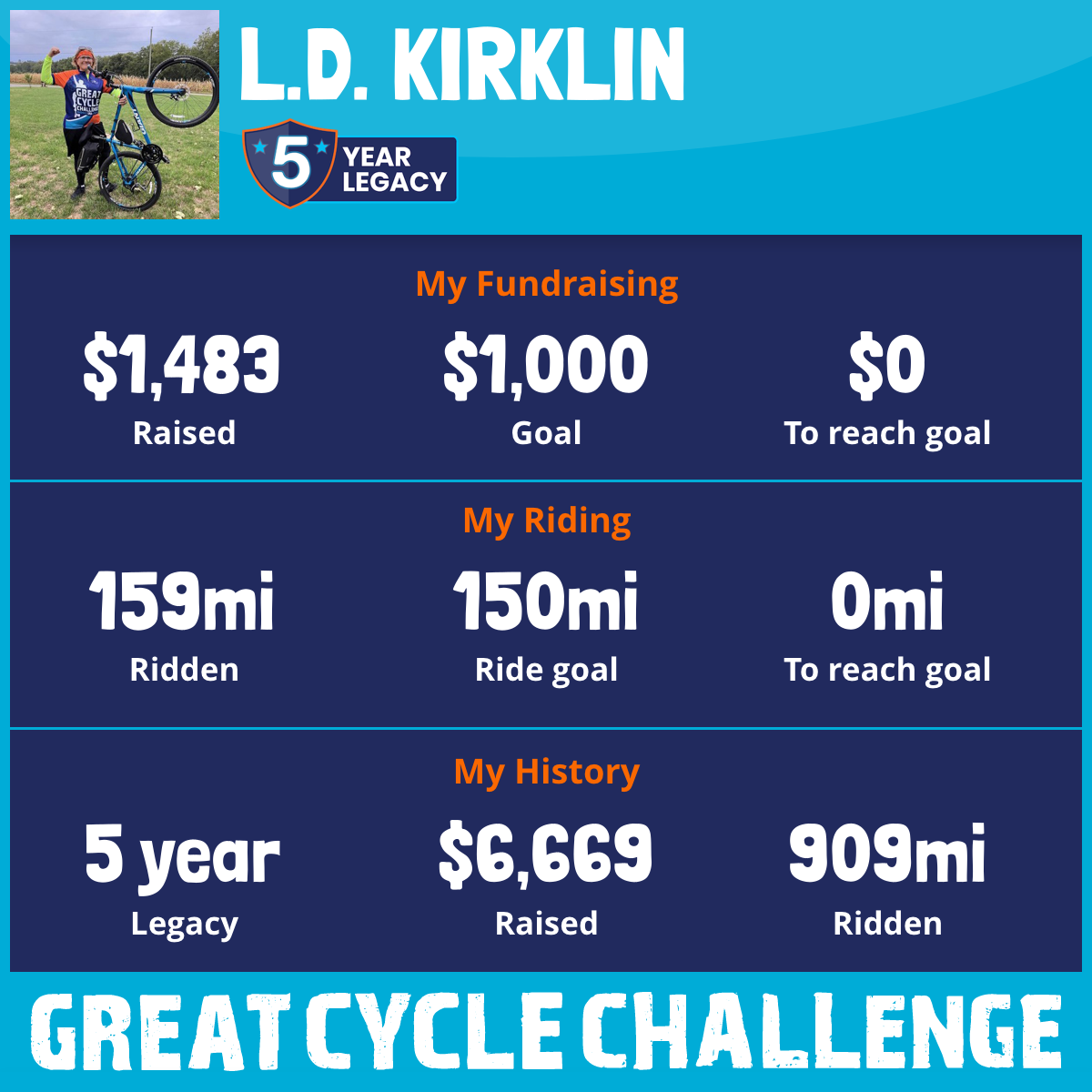When my pastor announced recently that he had been diagnosed with colon and liver cancer, I knew I needed to keep riding! While the money raised in this challenge goes toward cancer research for kids, I know that any and all research for cancer will help everyone. With God all things are possible!
