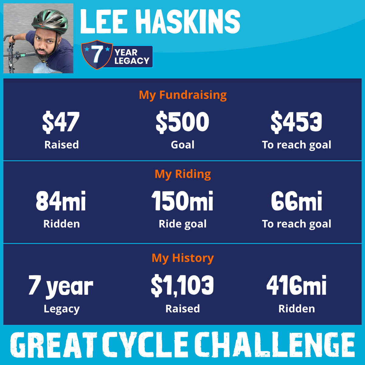 I am riding 150 mi in memory of Joan Haskins. Please sponsor me and support my challenge to fight kids' cancer and save little lives.