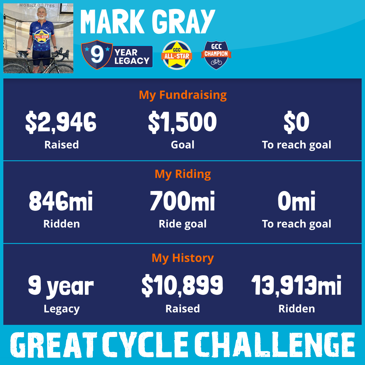 For nine years now I have had the honor of participating in the Great Cycle Challenge which raises money for children’s cancer research. I am again riding this year. The time of riding begins September 1st, but I can receive donations now. Last year I was honored to have had so many who helped and the financial goal was reached even before I started riding. This year I am trying to raise $1500. I will be attempting to ride 700 miles. At 67½ years of age this is a pretty steep goal, but it is such a worthy cause. Would you consider once again helping me reach that goal?