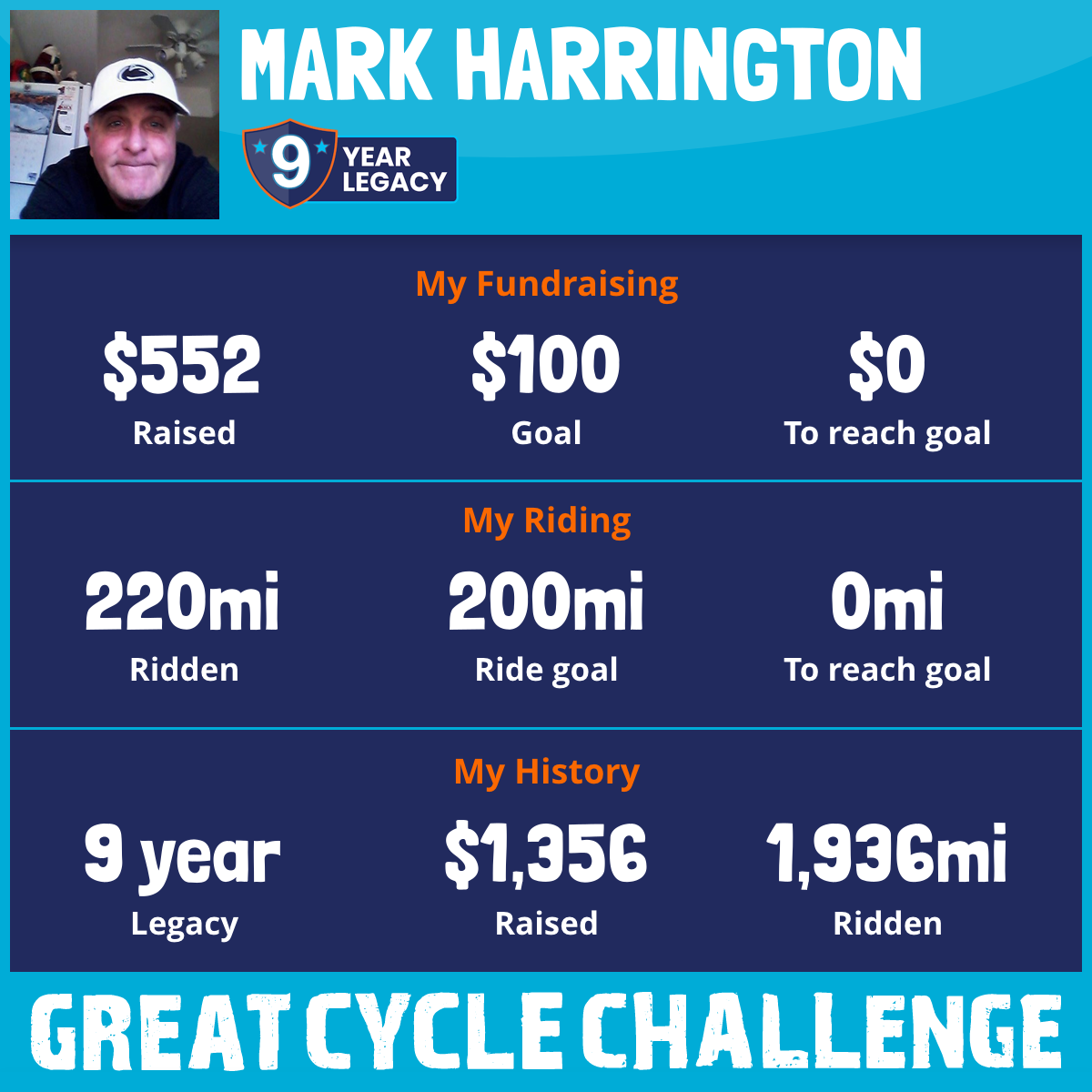 I am riding 200 mi in memory of Chester R. Harrington and Loraine Harrington. Please sponsor me and support my challenge to fight kids' cancer and save little lives.