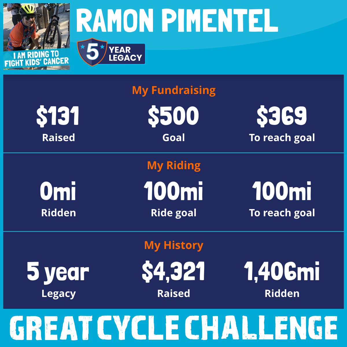 I am riding 100 mi to fight kids' cancer and save little lives. Please sponsor me to support my challenge!