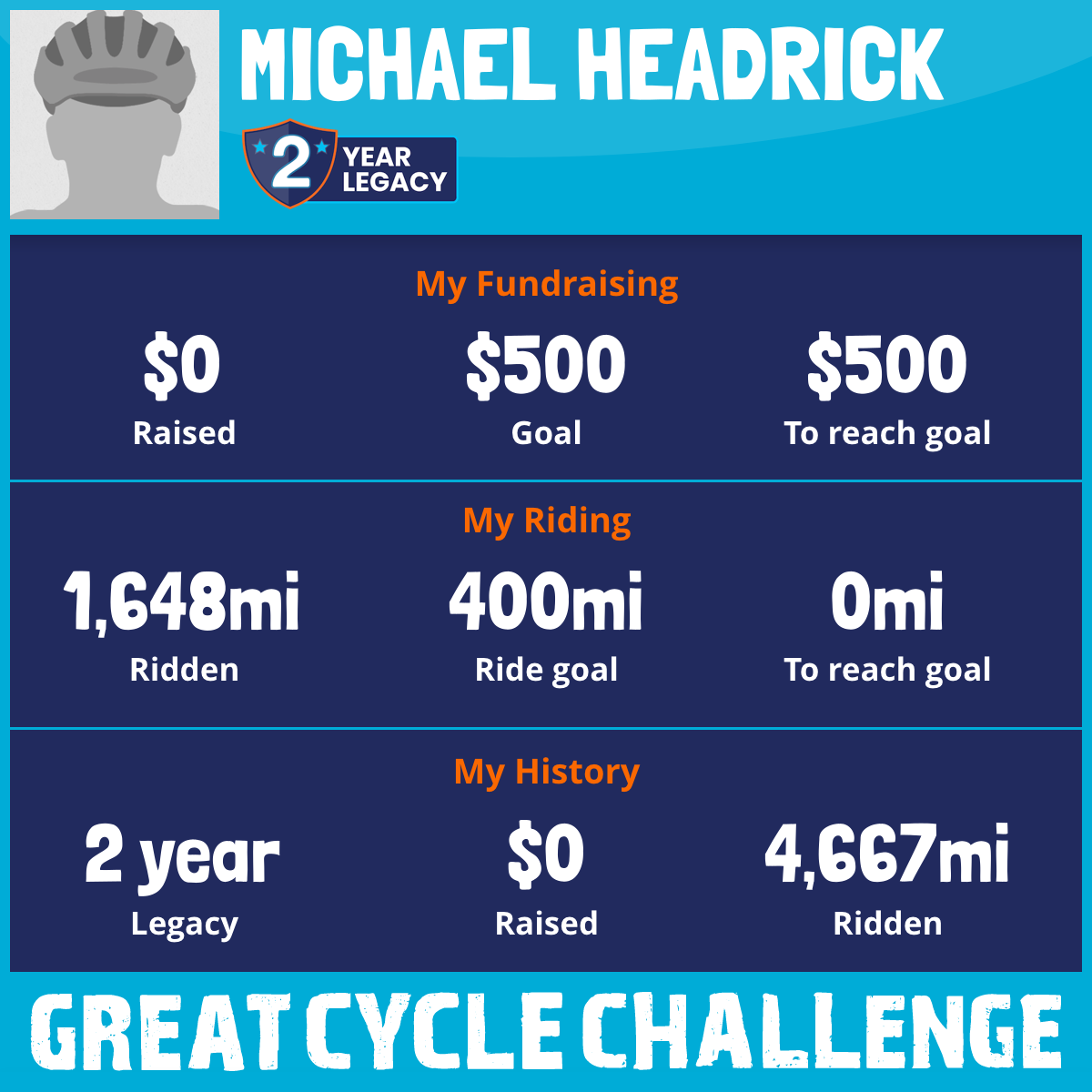 I am riding 400 mi in memory of Keith. Please sponsor me and support my challenge to fight kids' cancer and save little lives.
