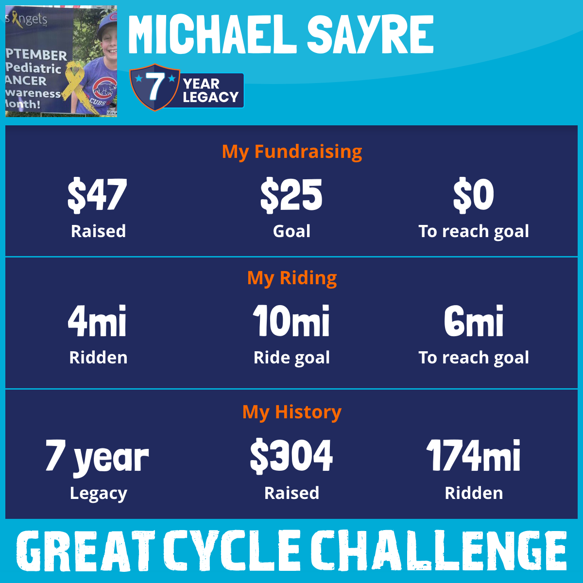 I am riding 10 mi for Will Yudys. Please sponsor me and support my challenge to fight kids' cancer and save little lives.