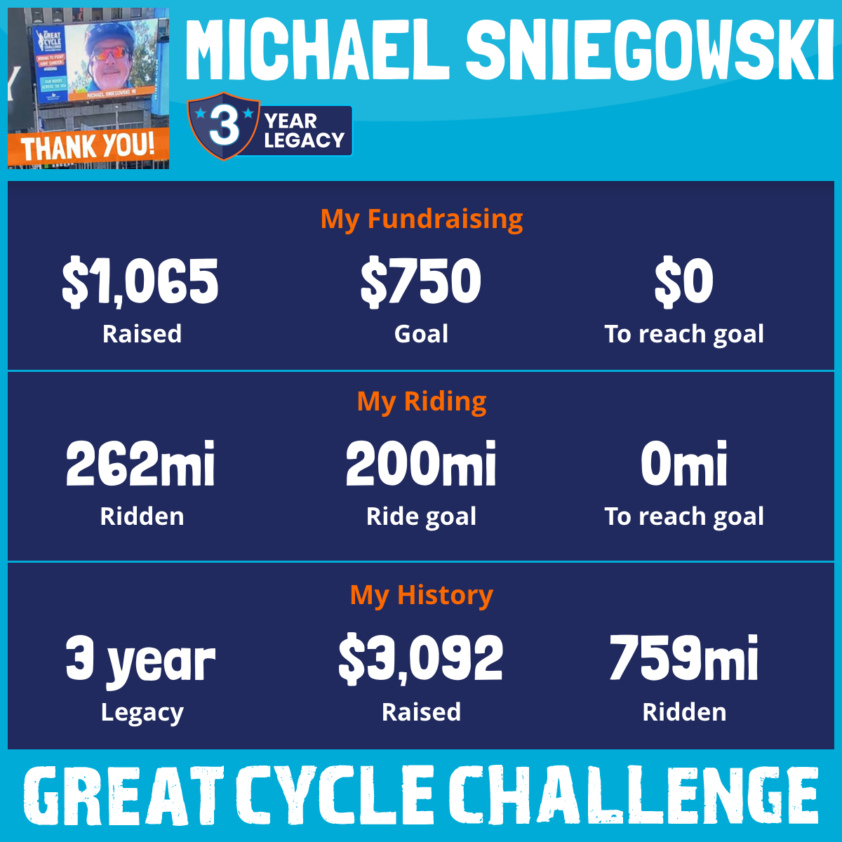 This September, I am taking part in the Great Cycle Challenge to fight kids' cancer! This is my third year riding for the cause. In the first two years I raise over $2000 and rode 500 miles. This year, I'm set a target of $750 but for sure will ride over 200 miles.