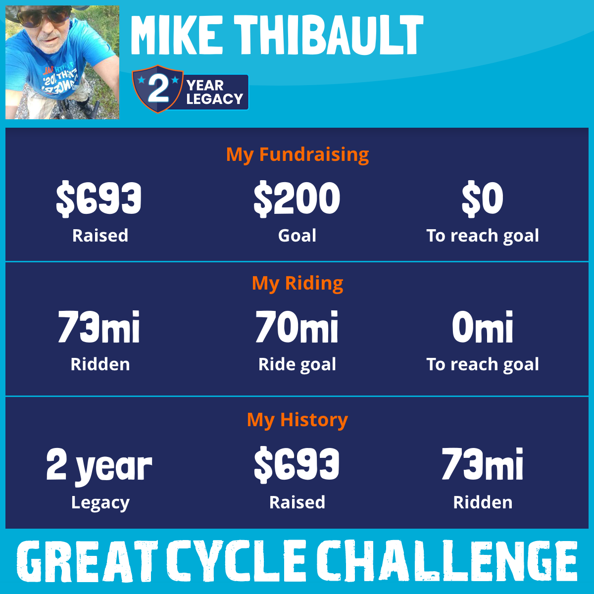 I am riding 100 mi for my loved one, Mand's my Daughter&Mom Lorraine,My Like Sister Cindy,and in Memory of my X Spouse Pat who left us. Please sponsor me and support my challenge to fight kids' cancer and save little lives.