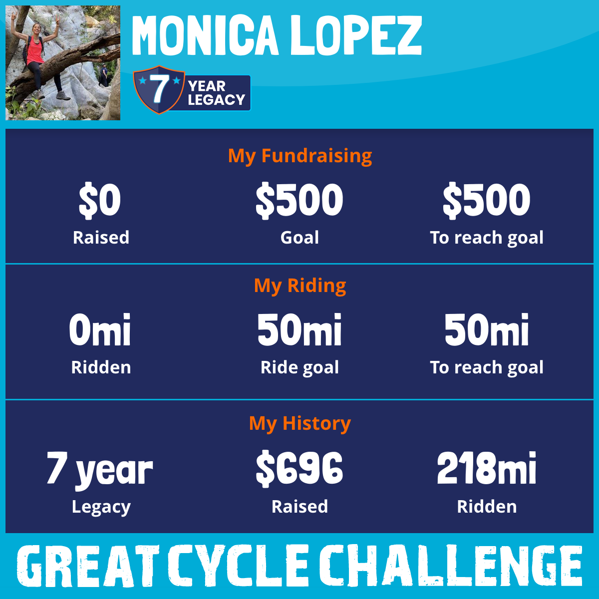 I am riding 50 mi for Moni. Please sponsor me and support my challenge to fight kids' cancer and save little lives.