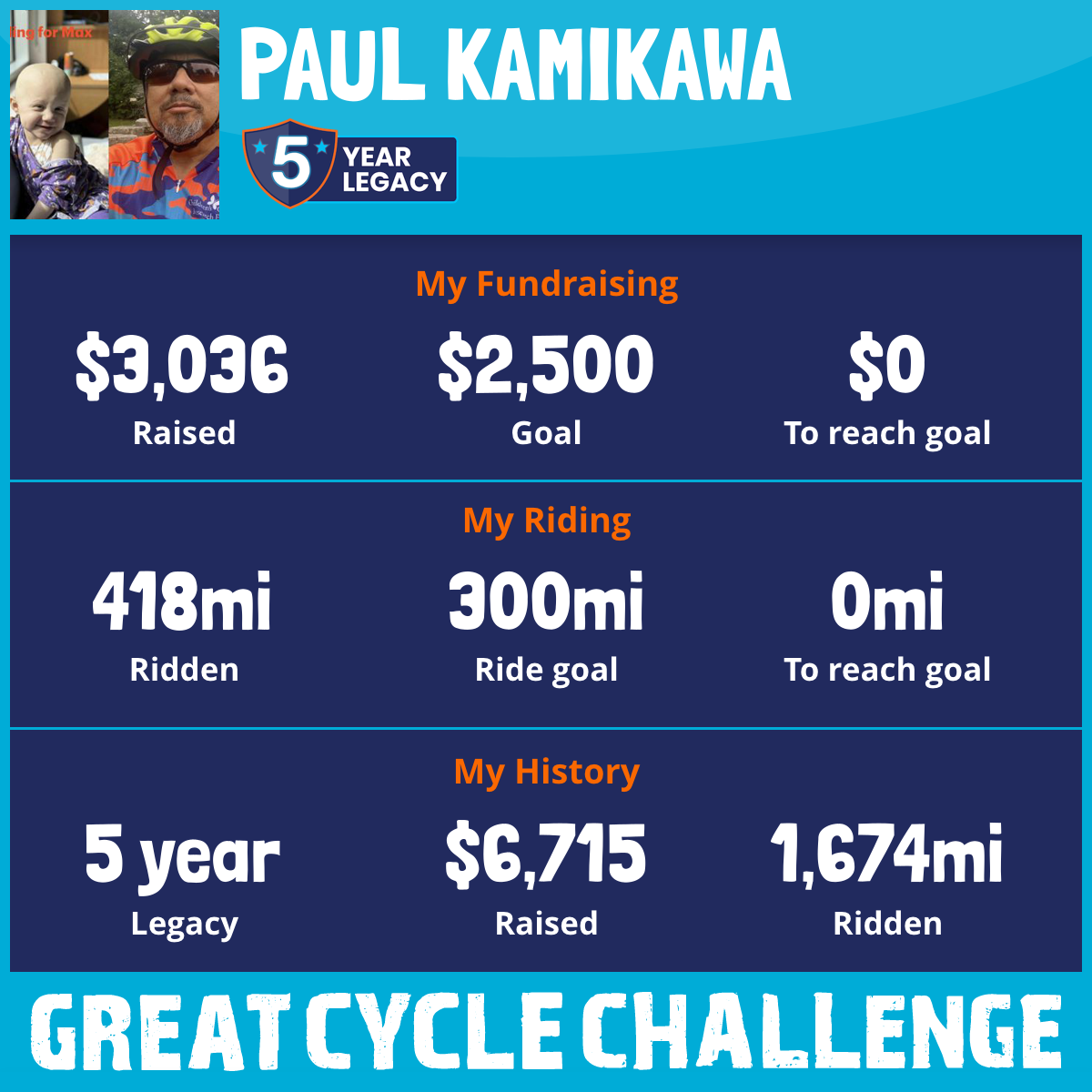 Thanks for all who have contributed in the past and consider again this year. I have upped my dollar goal this year, $2,500. I welcome new patrons and this year I am riding with increased purpose and spirit.