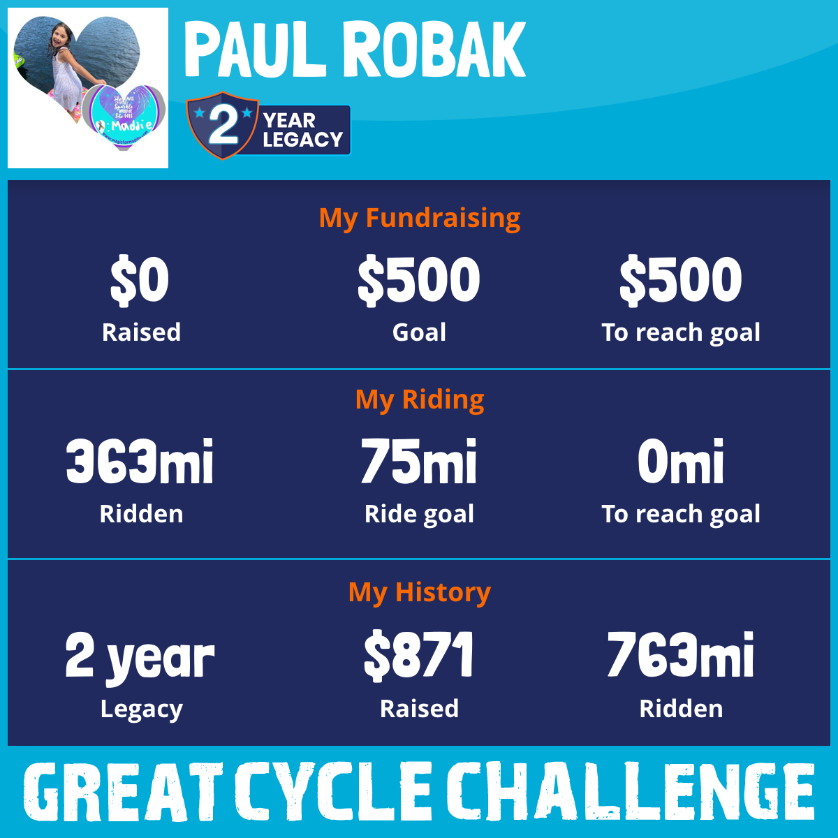 I am riding 75 mi in memory of Maddie. Please sponsor me and support my challenge to fight kids' cancer and save little lives.