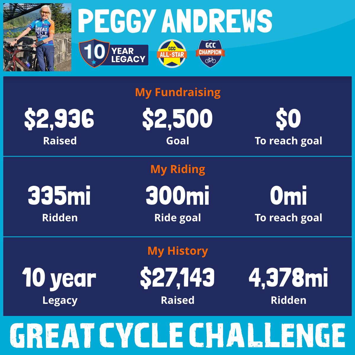 As a caretaker, I bike for mental health as well as to supporting this vital cause. Please help if you can, even if it is just being careful as you pass bikers. I'm planning on doing as much as my almost 80-year-old body will allow, I have committed to 200 miles, but my mind says do more, my body doesn't always agree with my mind.