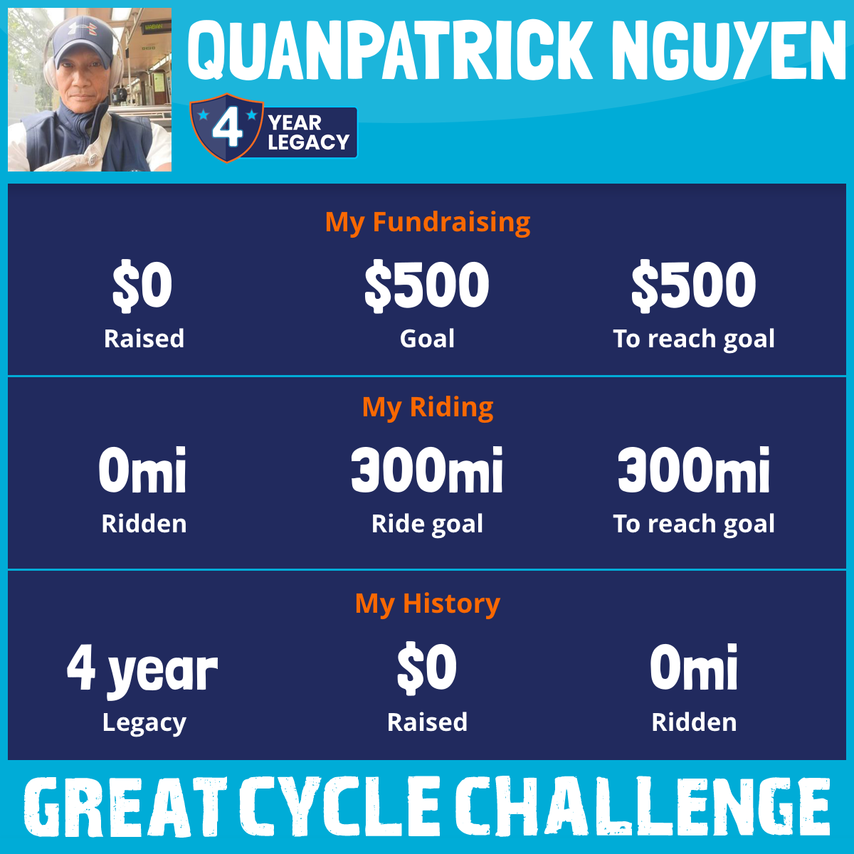 I've raised $0 My goal is $500 Donate Now
