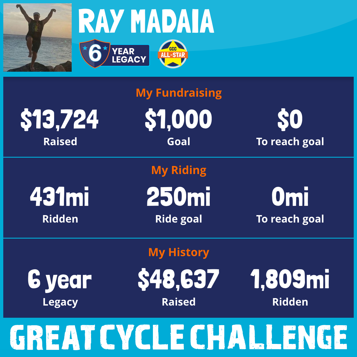 "I’m back…" This September, I am taking part in the Great Cycle Challenge to fight kids' cancer for the SIXTH straight year! If you were part of my pit crew in 2020, 2021, 2022, 2023 and 2024 our donations raised an outstanding $34,913 and inspired me to ride 1378 miles!!!!!